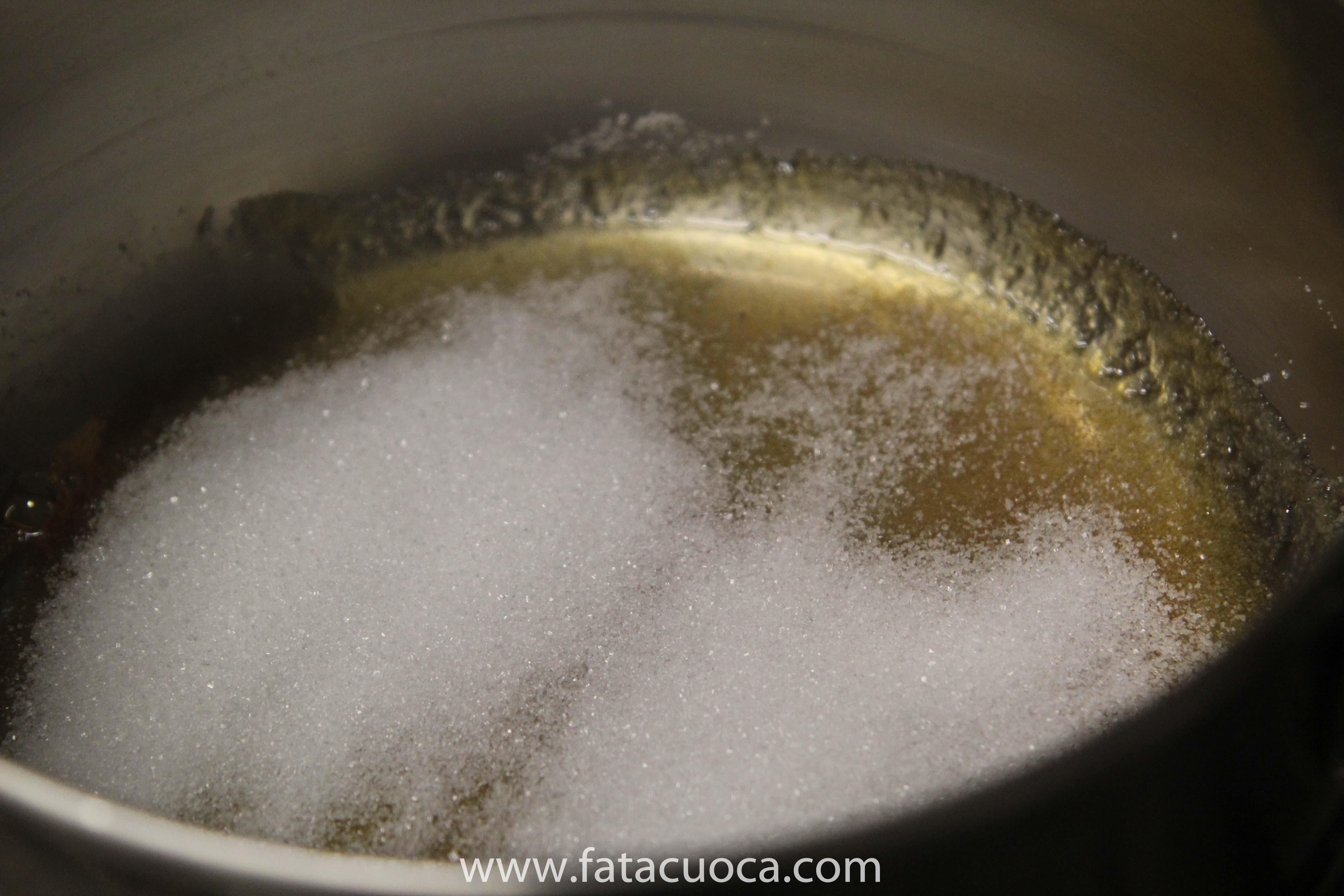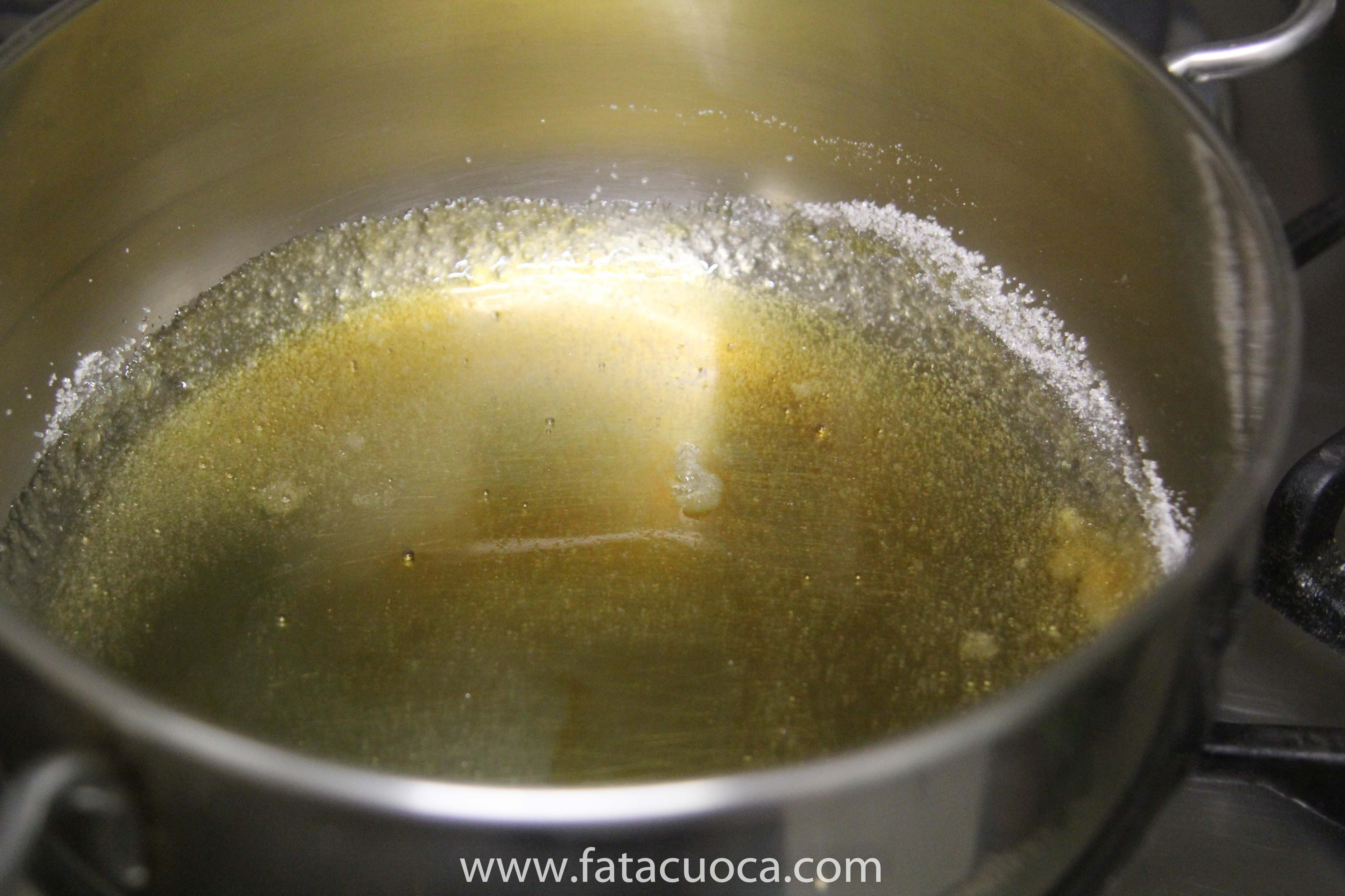 in un tegame mettere un po’ di zucchero e scaldare fino a che lo zucchero cominci a caramellare