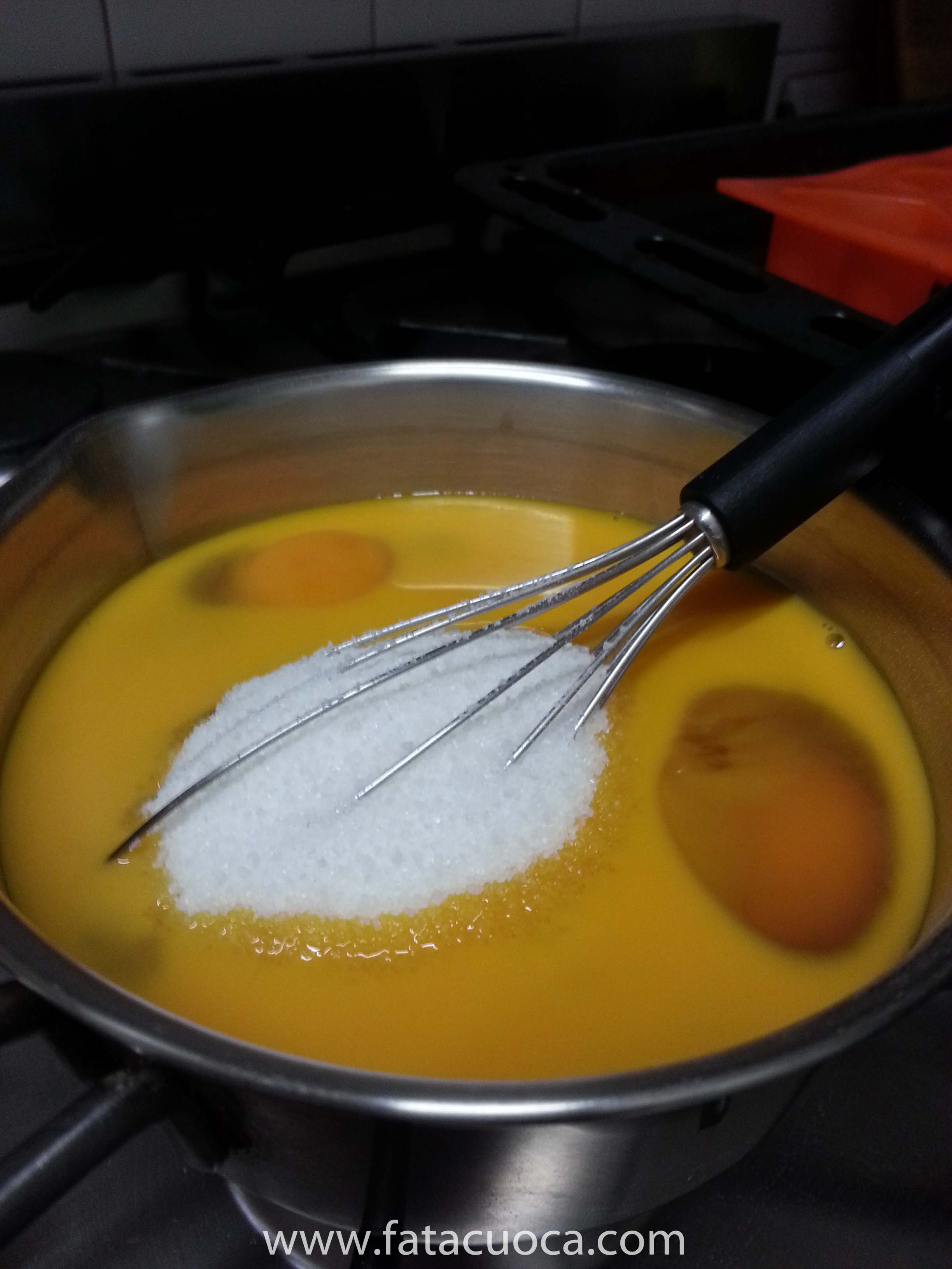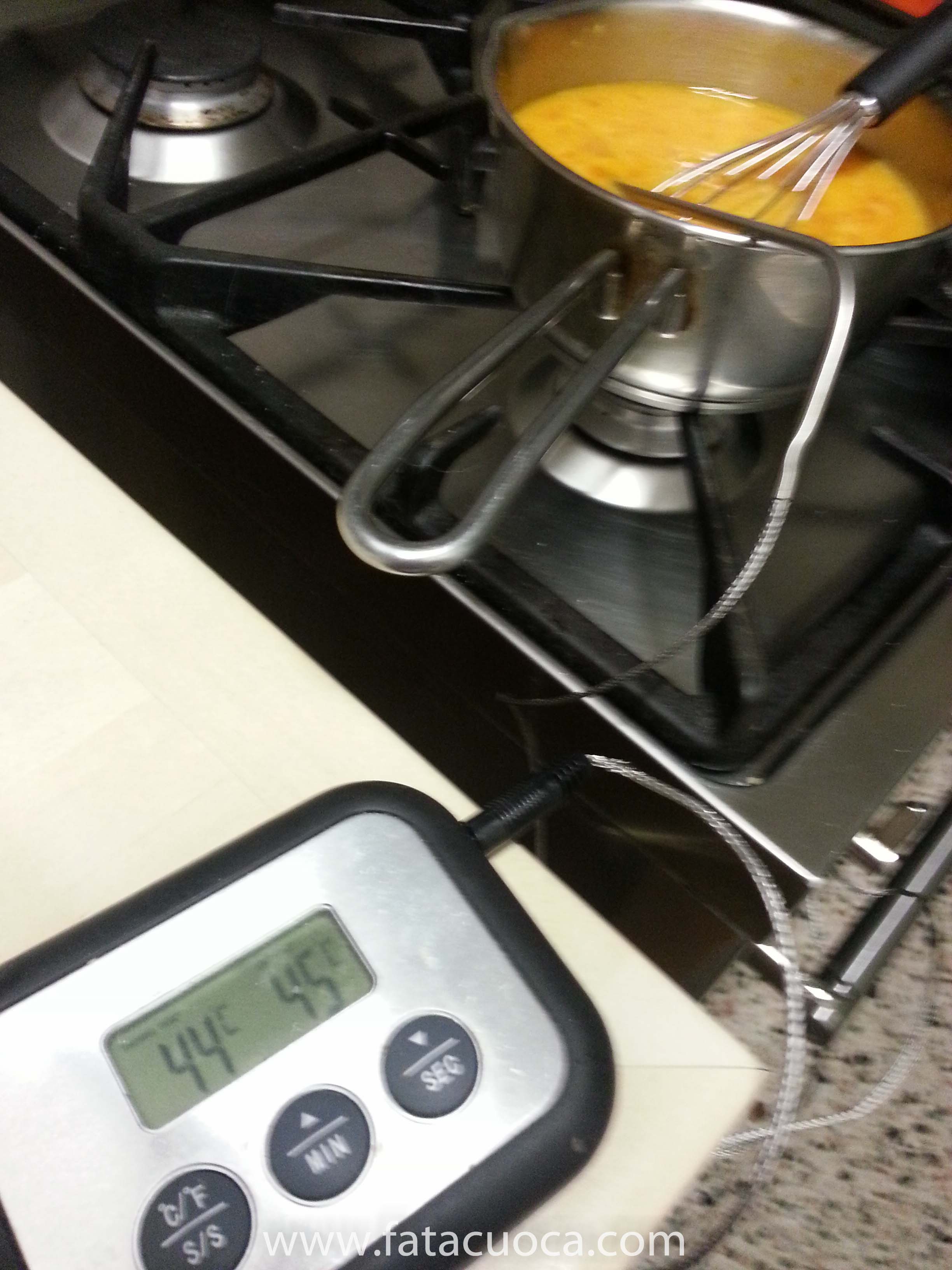 pastorizzare le uova mettendole in un tegamino con lo zucchero e portarlo a 45°C questo passaggio è molto importante dato che l’interno del tortino è cremoso.