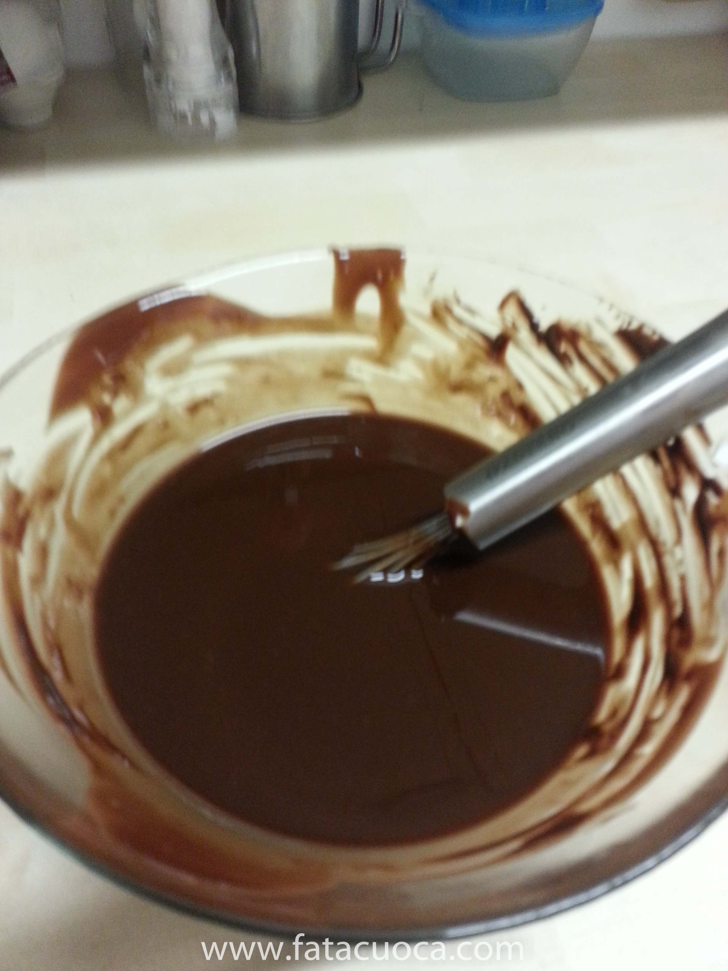Sciogliere il cioccolato a bagno maria o al microonde e aggiungere il burro morbido