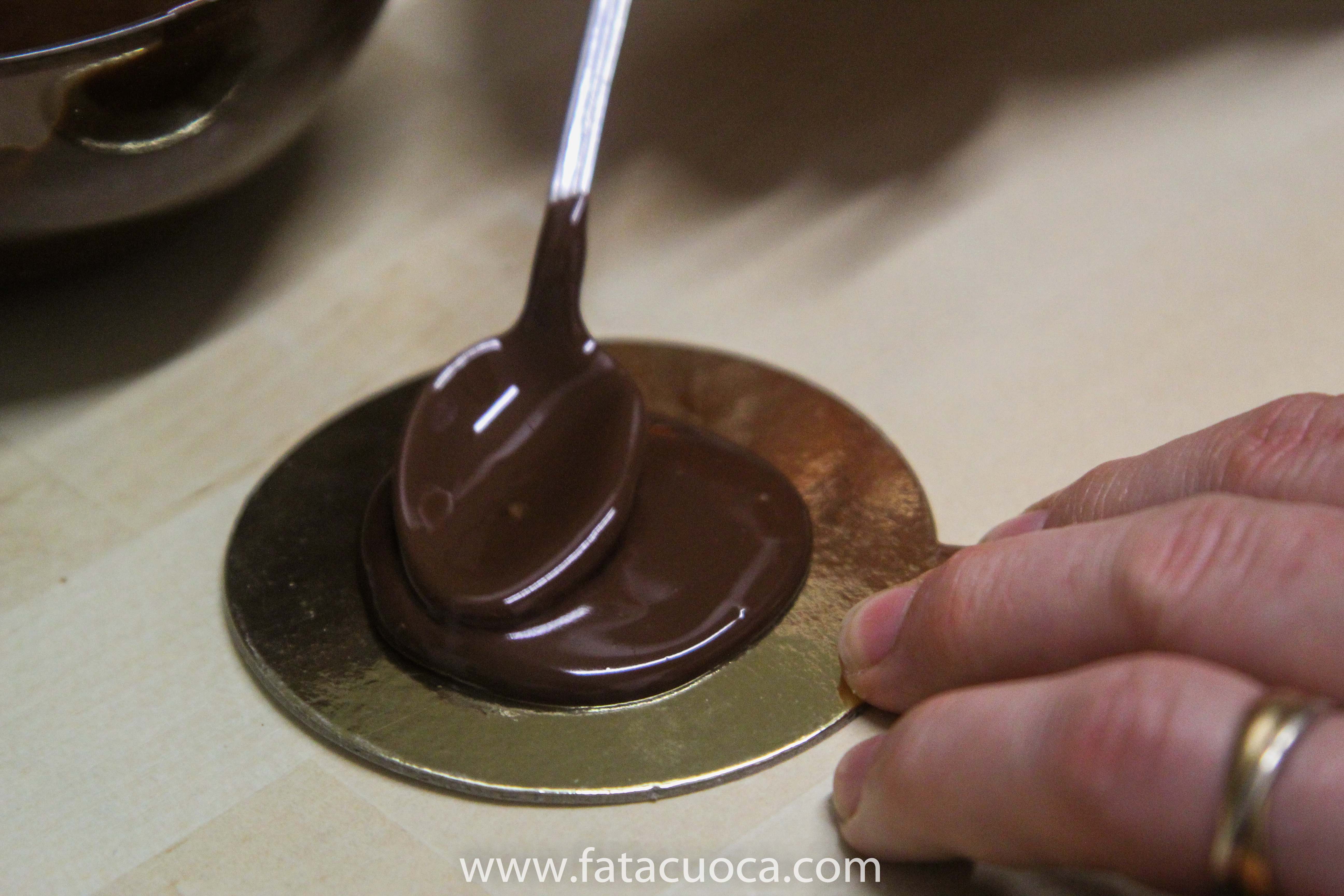 Per prima cosa fondere il cioccolato facendo attenzione a non superare i 32°C  e mettere un cucchiaino di cioccolato su un piattino