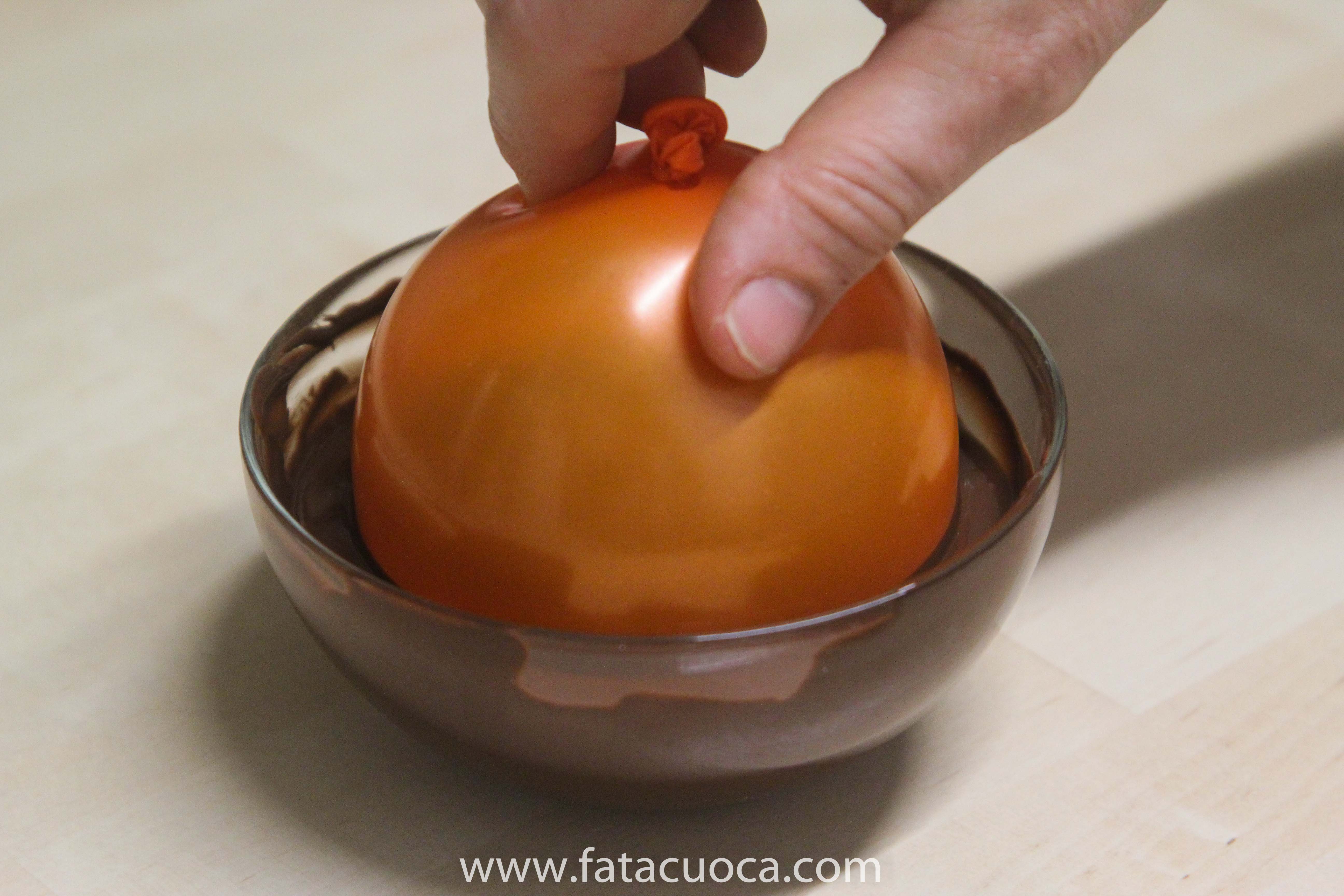 gonfiare un palloncino piccolo e immergerlo nella coppetta dove abbiamo sciolto il cioccolato