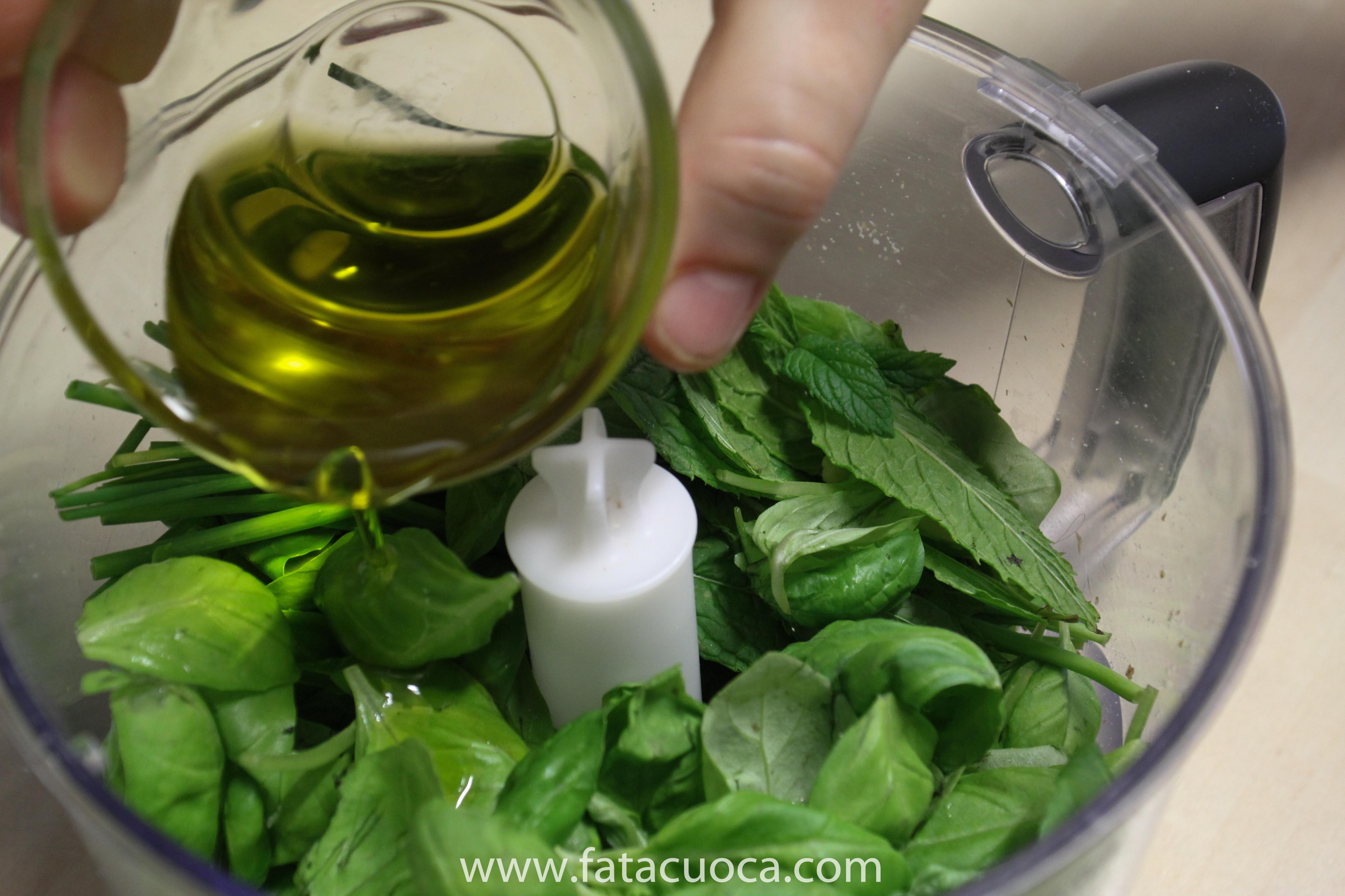 aggiungere  le erbe aromatiche  e aggiungete un filo l’olio (, azionate il mixer e