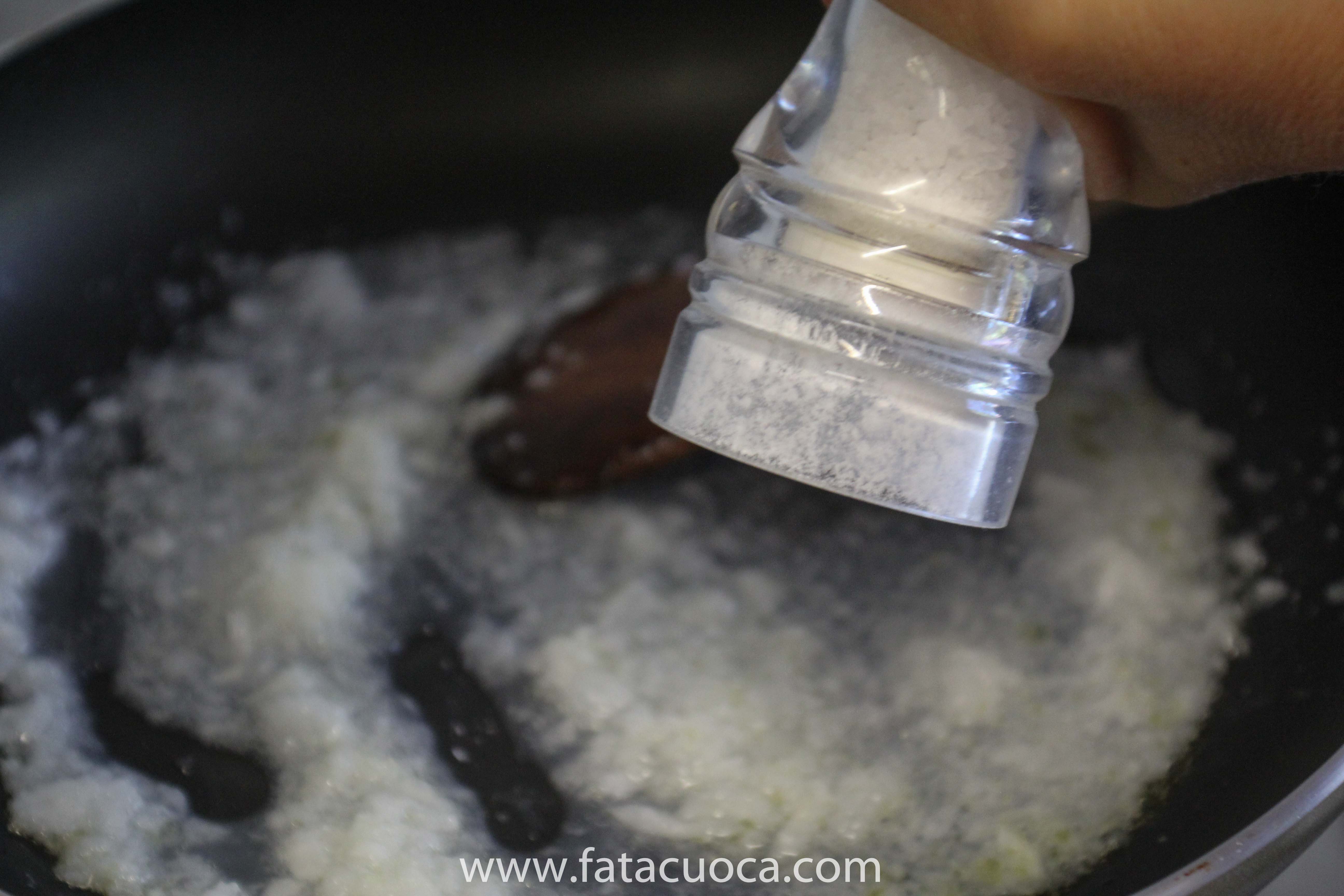 tritare la cipolla e metterla a rosolare con un cucchiaio d’olio circa 10 g e un cucchiaio d’acqua