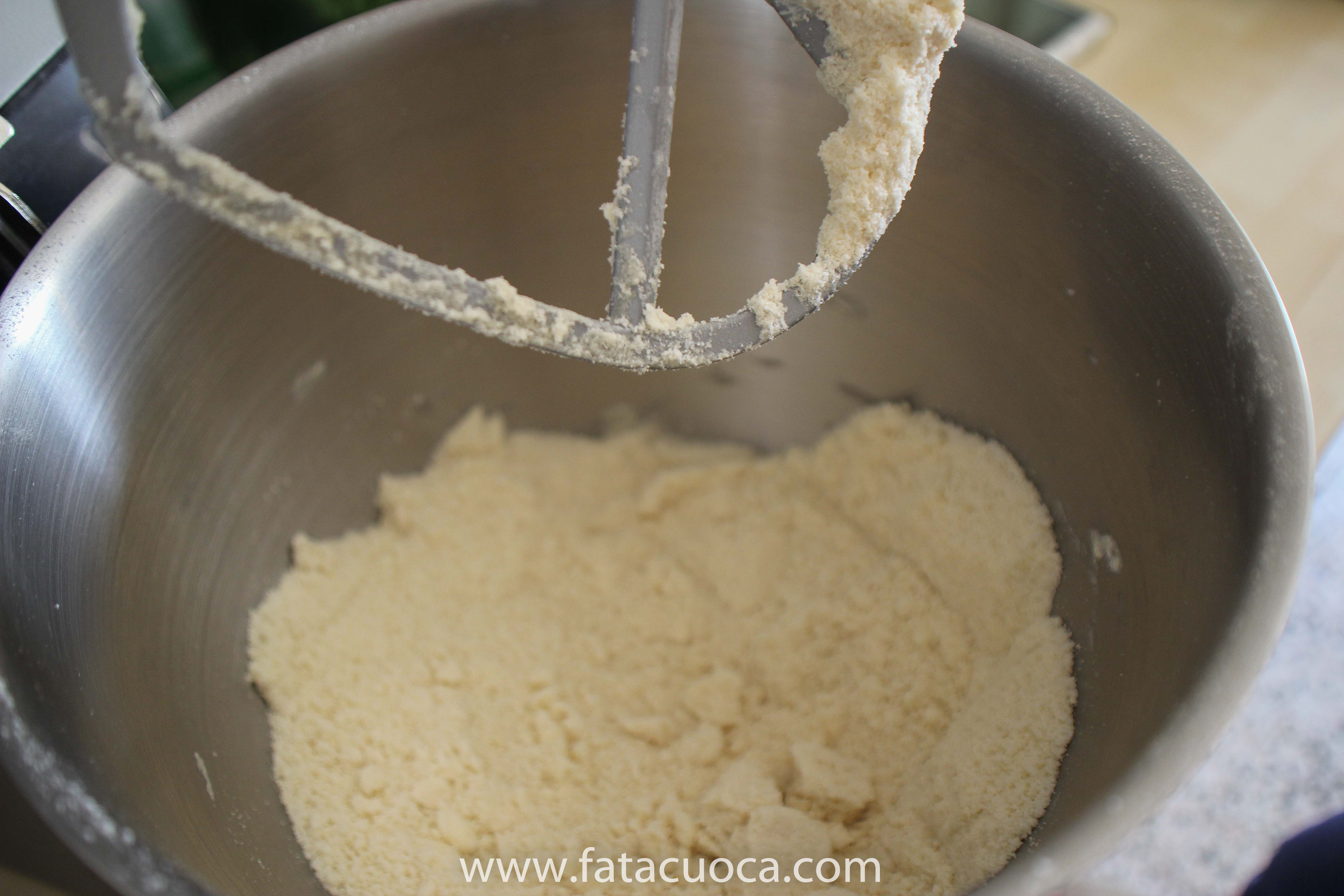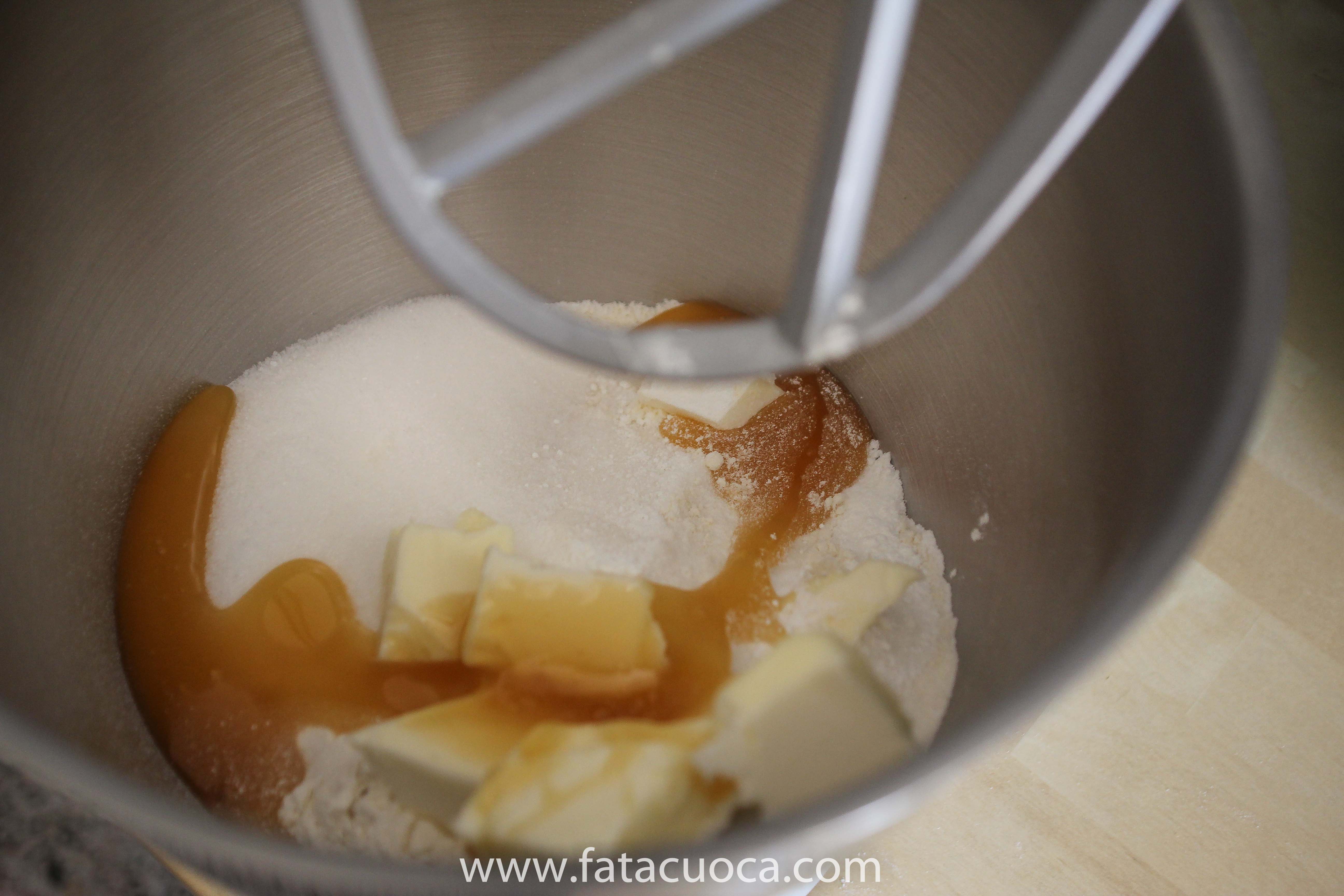 per prima cosa sabbiare farina, zucchero, miele, burro e lievito