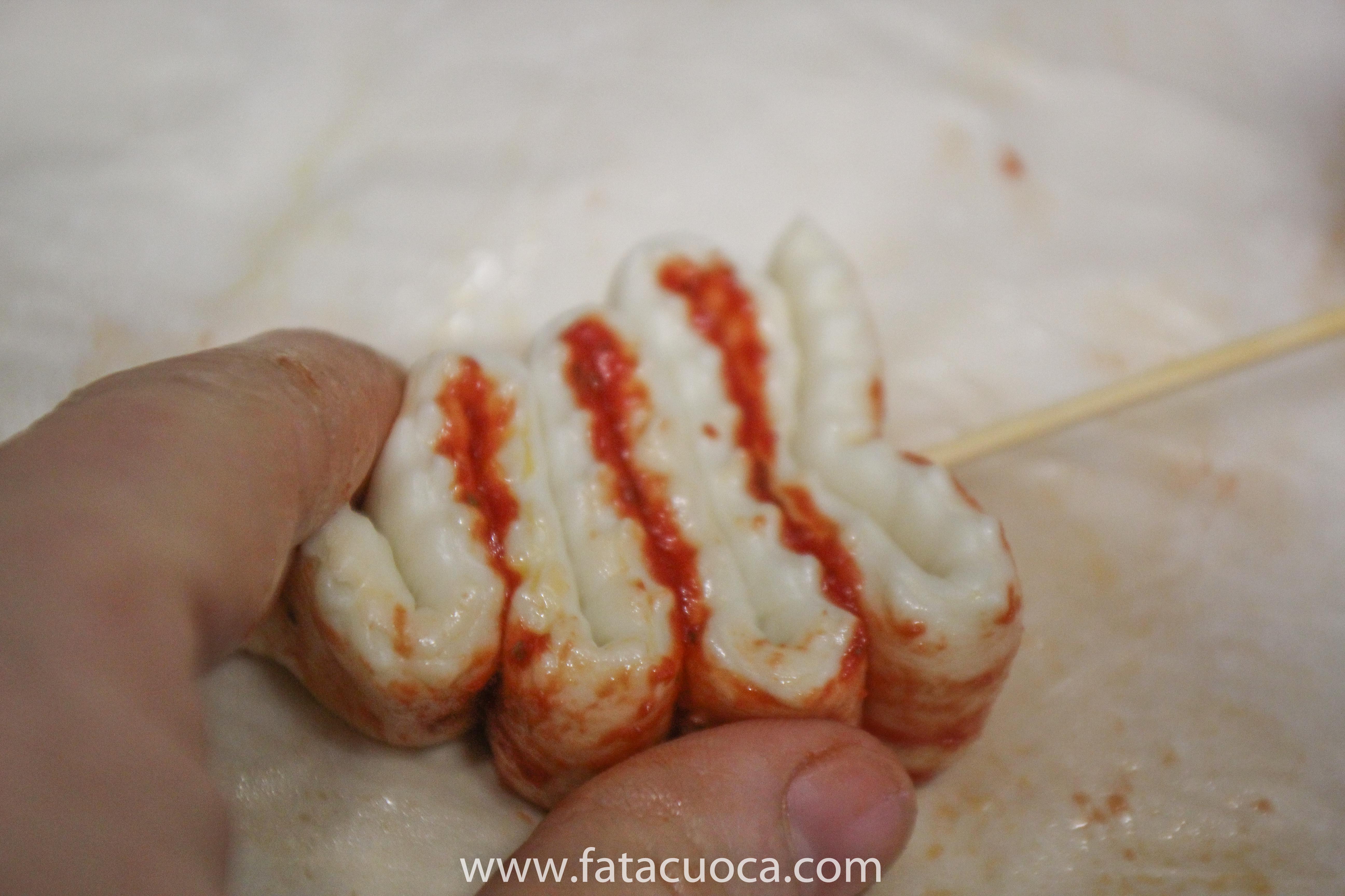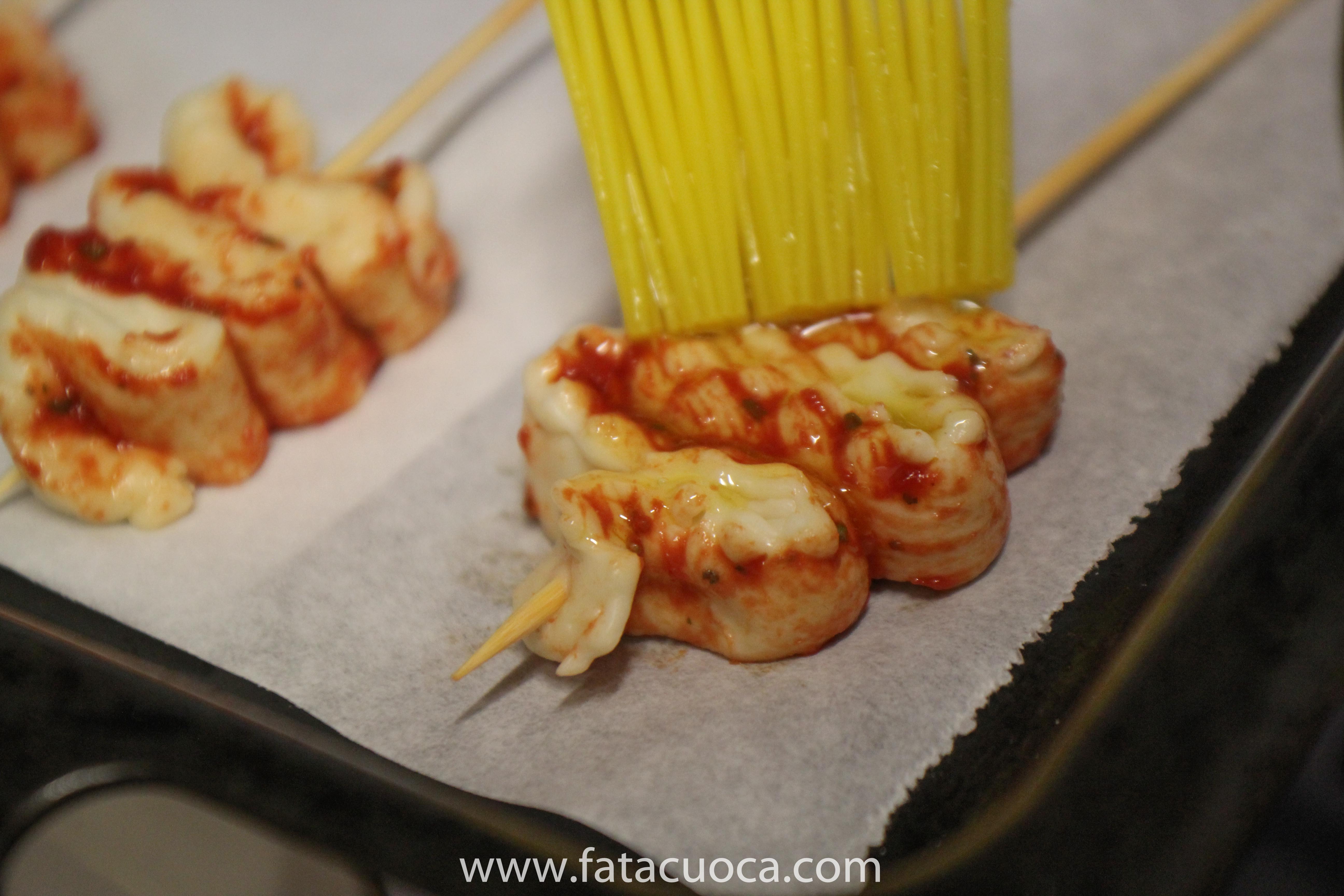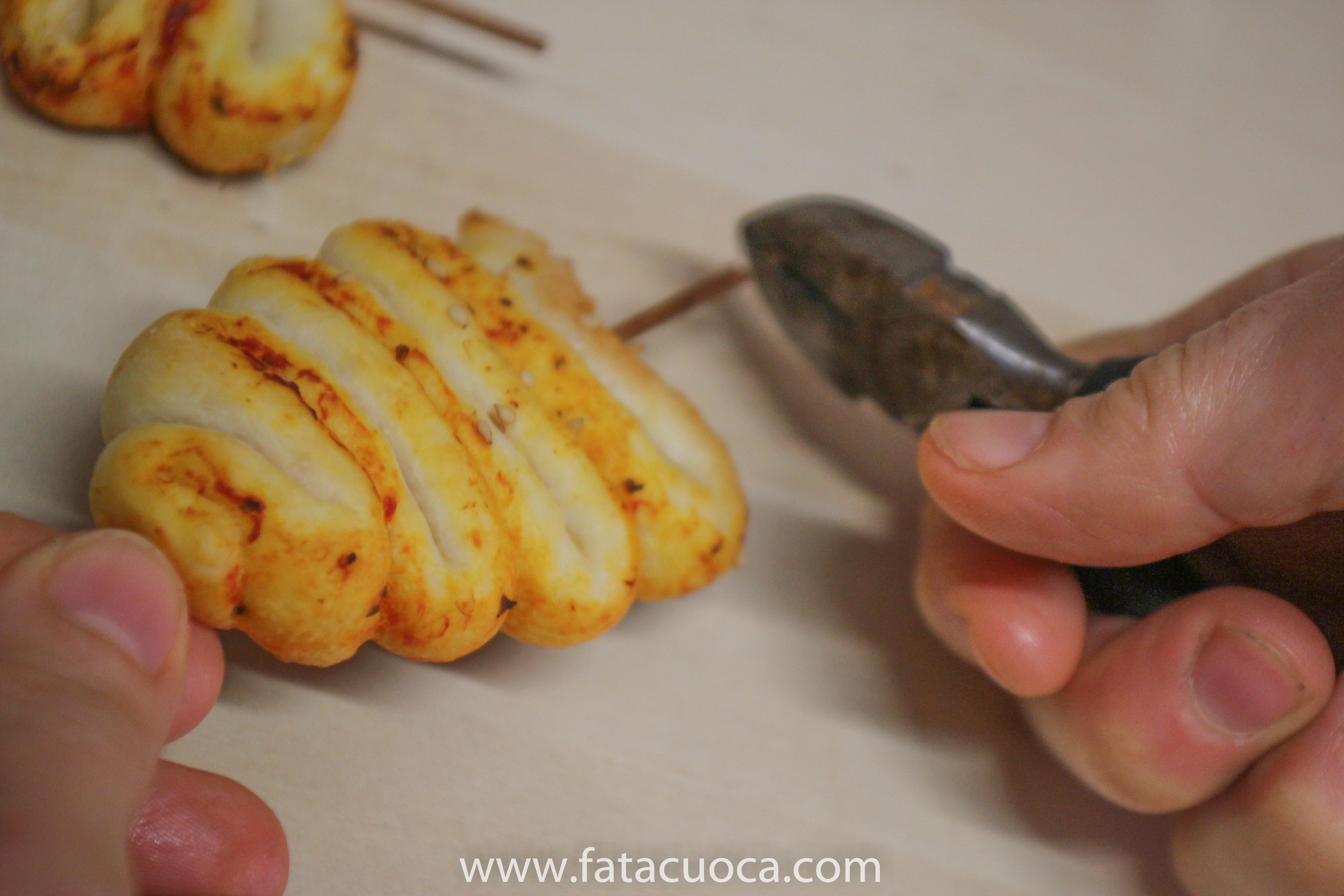 per farli stare in piedi inserire gli spiedini in un pezzetto di formaggio a piacere io ho usato quelli con la carta rossa in alternativa un cubetto di prosciutto cotto o un pezzetto di wurstel oppure si possono fare dei cubetti di polenta magari anche arrostita in forno!