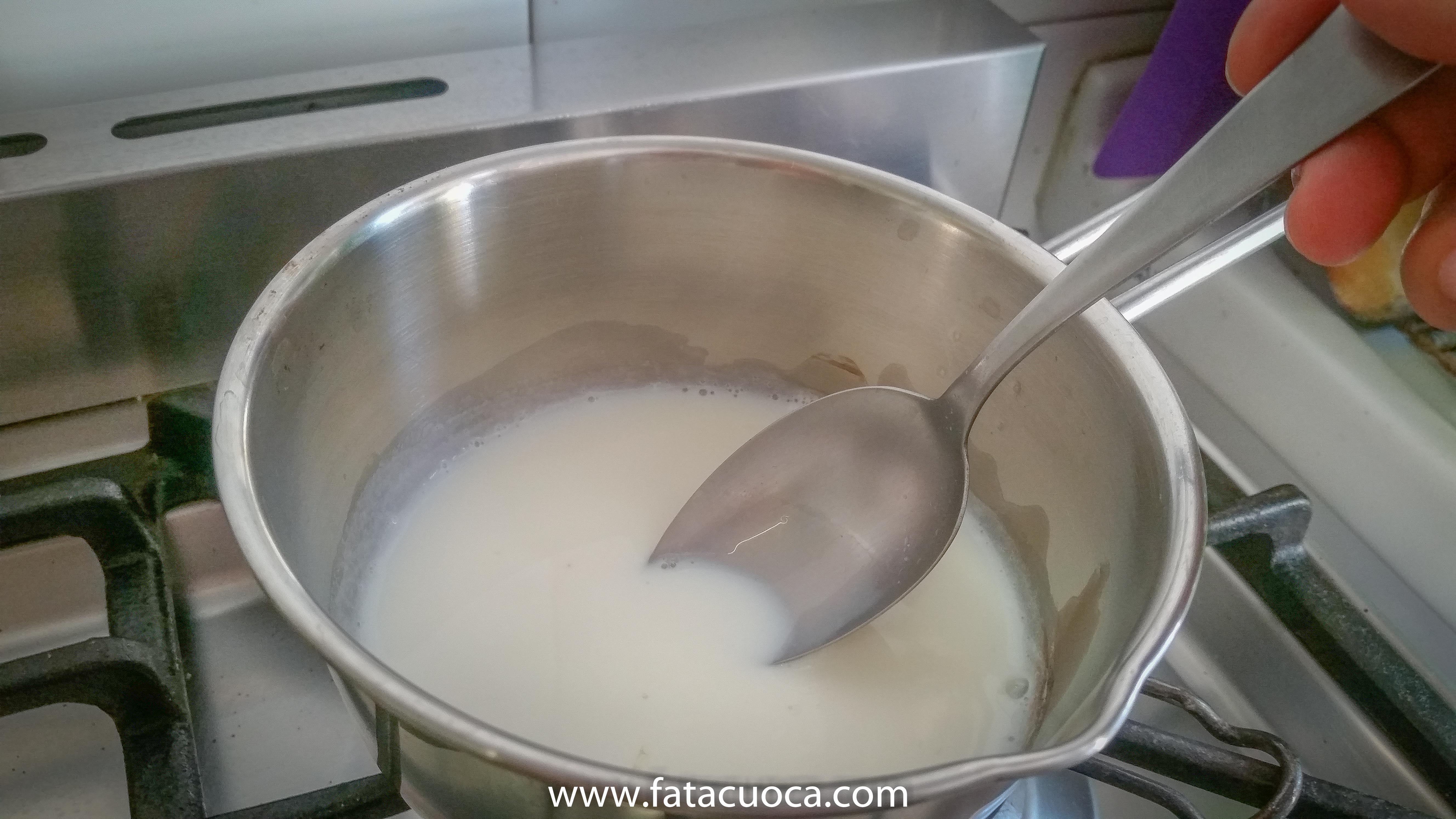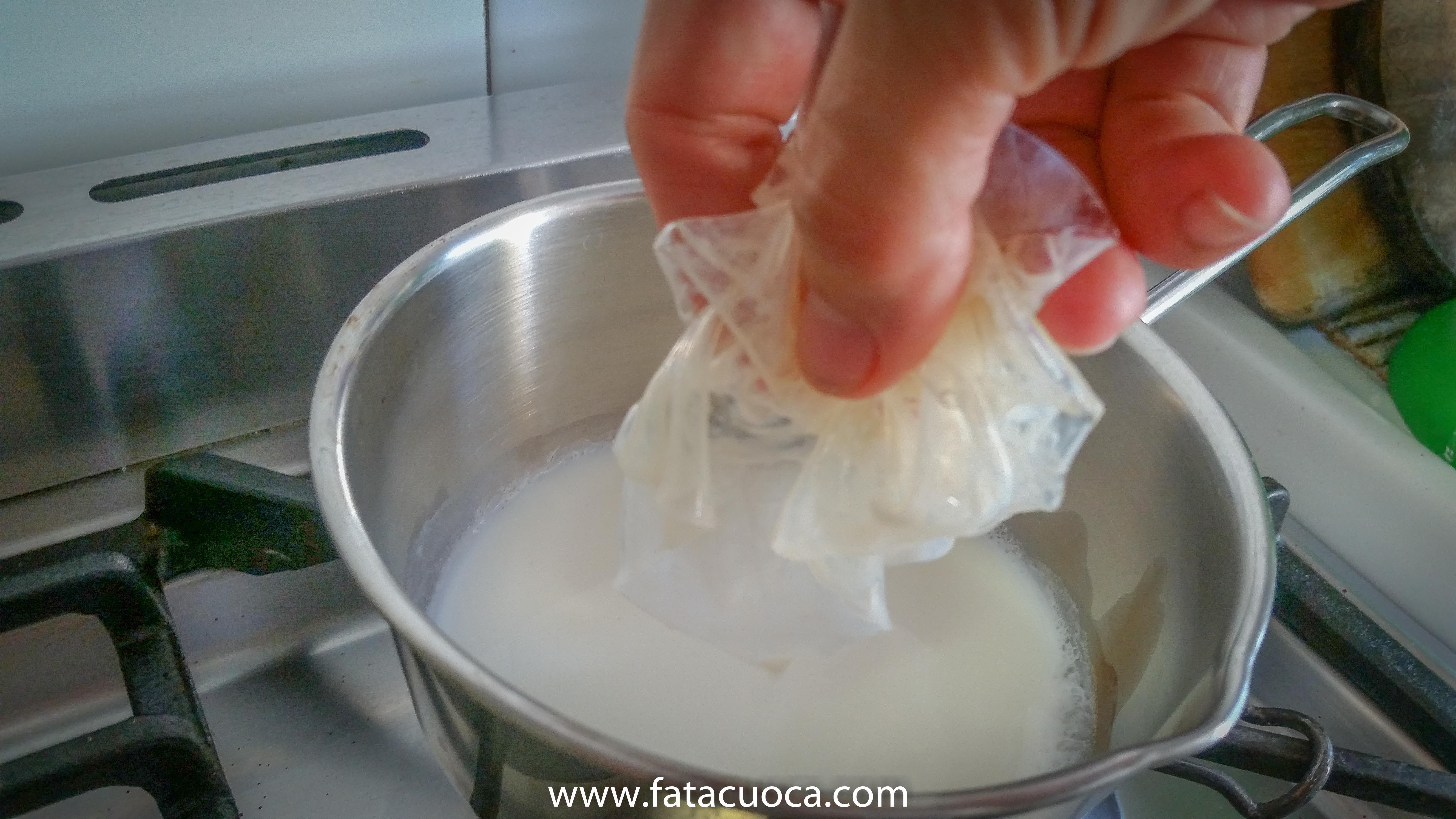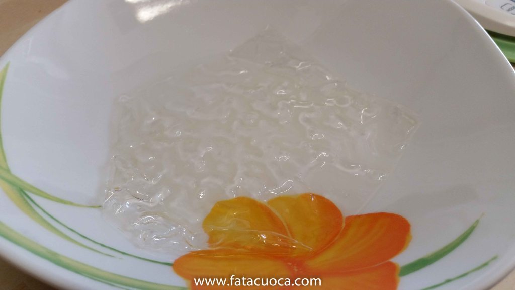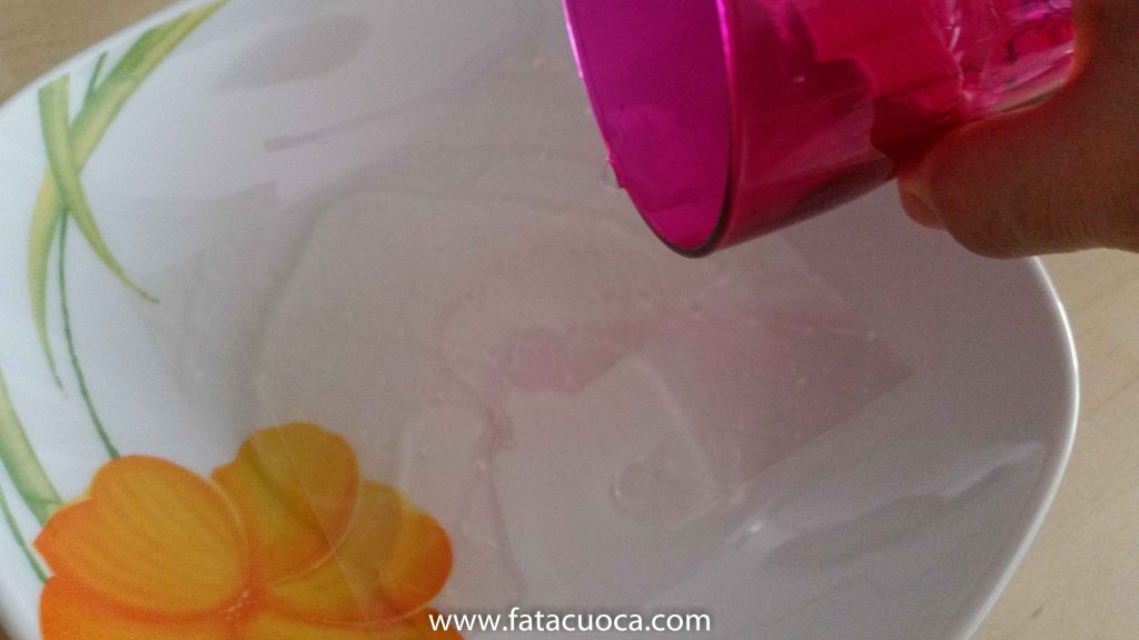 per prima cosa mettere a bagno la gelatina con l’acqua in modo che si idrati