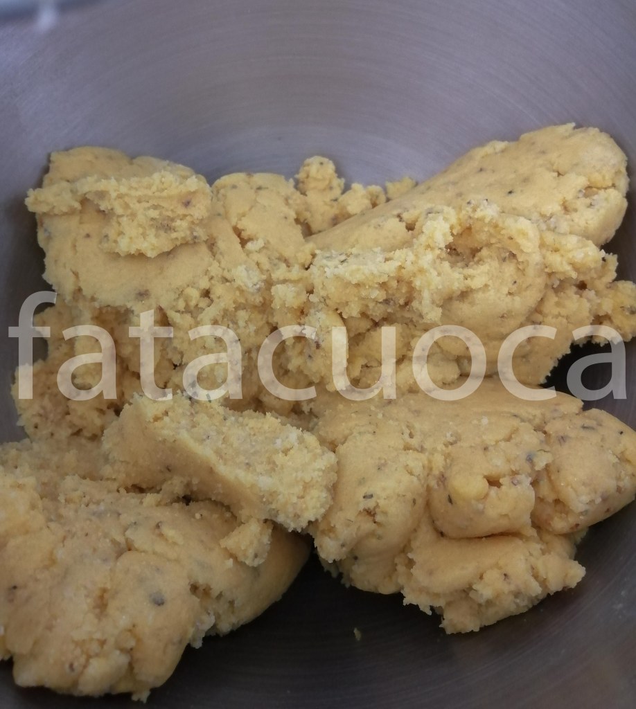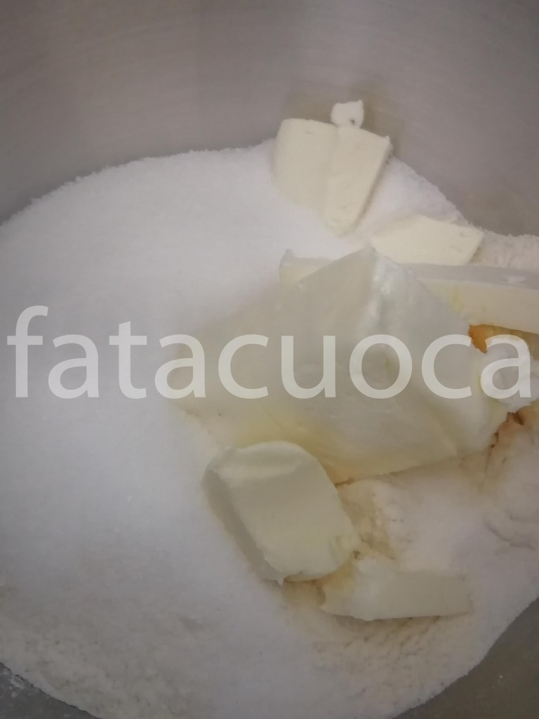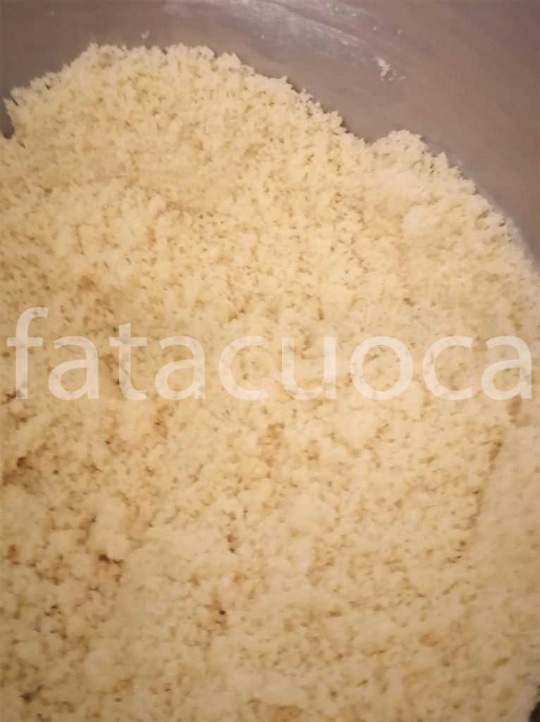 in una ciotola mettere le farine, lo zucchero, il pizzico di sale, il lievito e il burro ed impastare fino ad ottenere un composto sabbiato