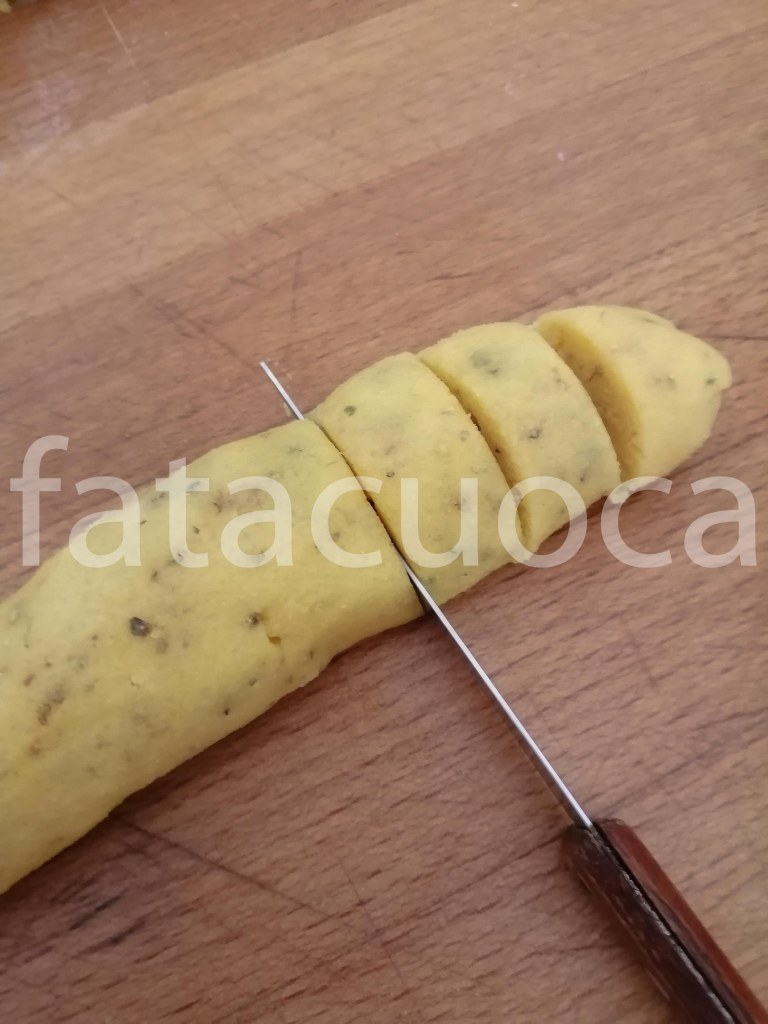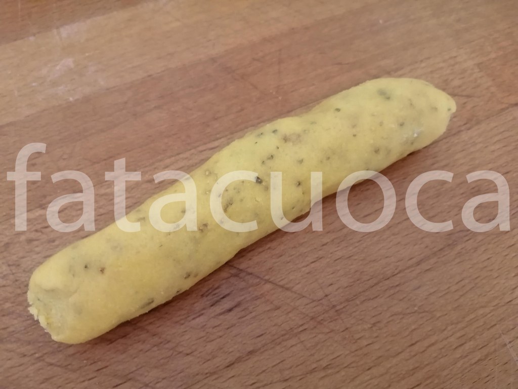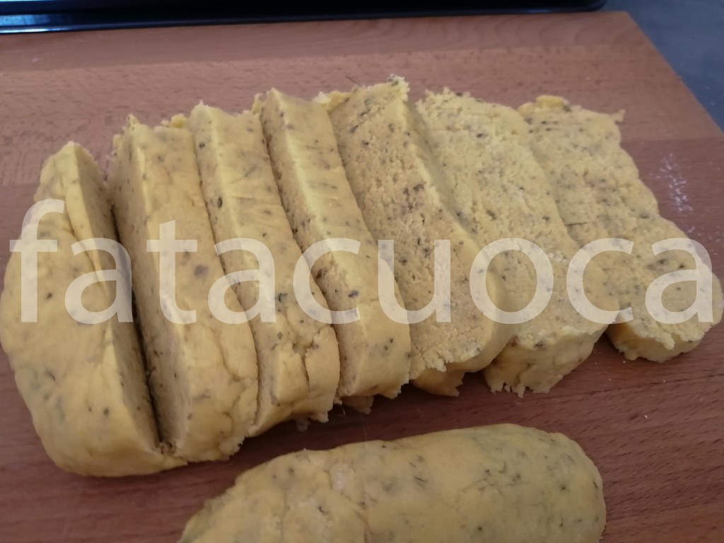 Tagliare a pezzi l’impasto uniformare i filoncini arrotolandoli con le mani tagliare dei tocchetti di circa 2 cm