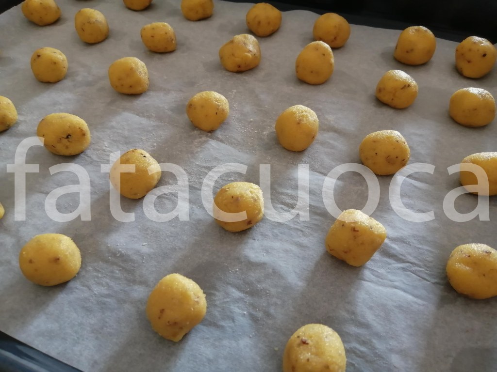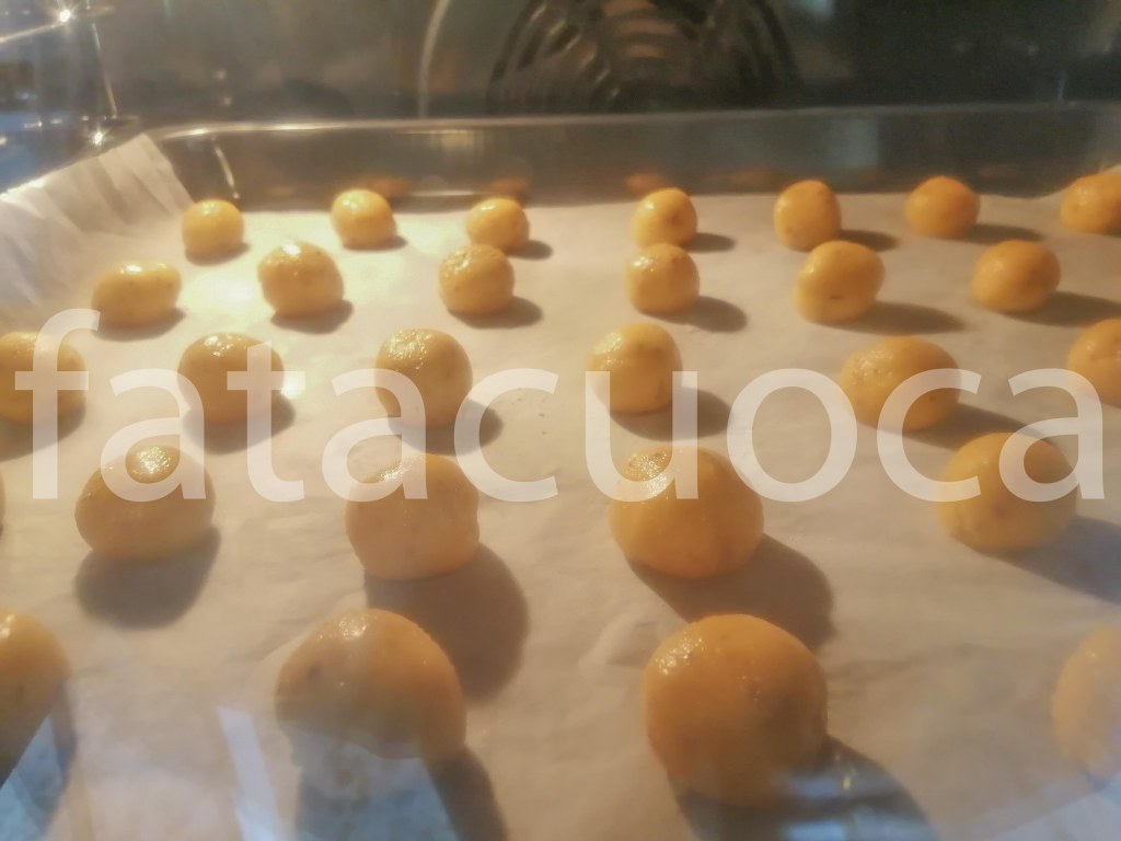 e fare delle palline di circa 10 g l’una disporle su una teglia coperta di carta forno. L’impasto necessita almeno 2 teglie.
