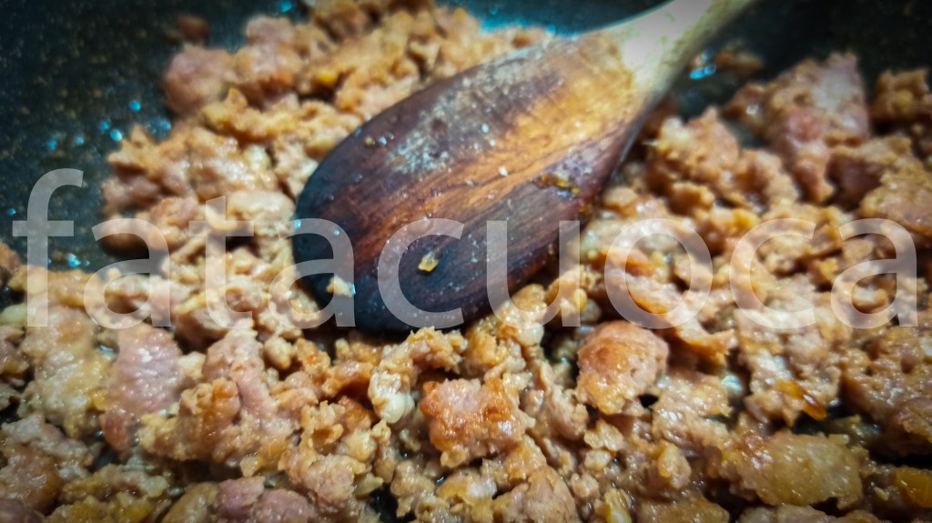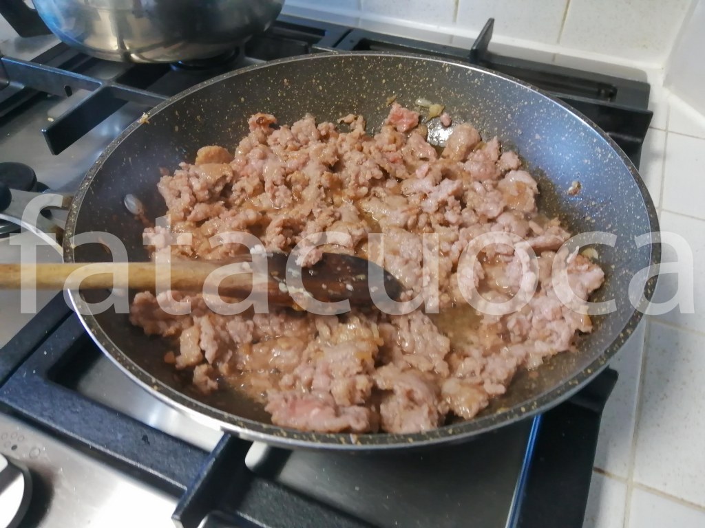PER LA SALSICCIA: tritare lo scalogno e lasciarlo rosolare con poco olio, aggiungere la salsiccia sgranarla e sfumarla con il vino e lasciarla cuocere a fuoco dolce fino a rosolatura.