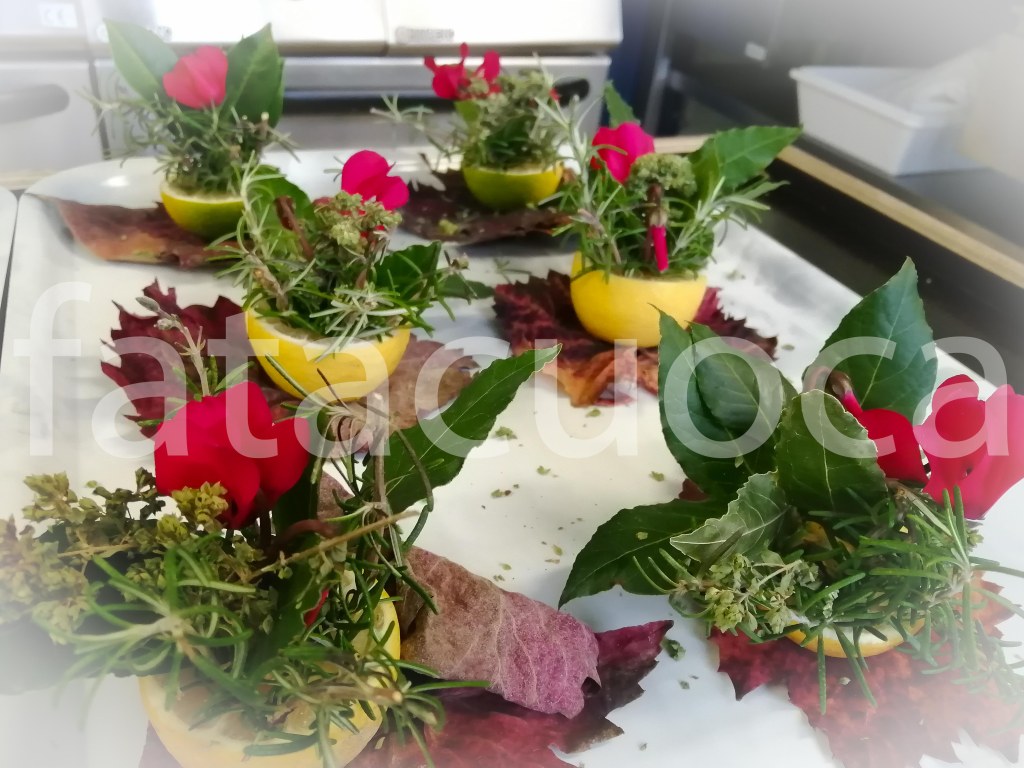 Li ho preparati anche i più piccini della sezione Lattanti utilizzando : foglie di vite, mandarini, limoni, rosmarino, alloro e origano completando con fiori di ciclamino del nostro giardino.