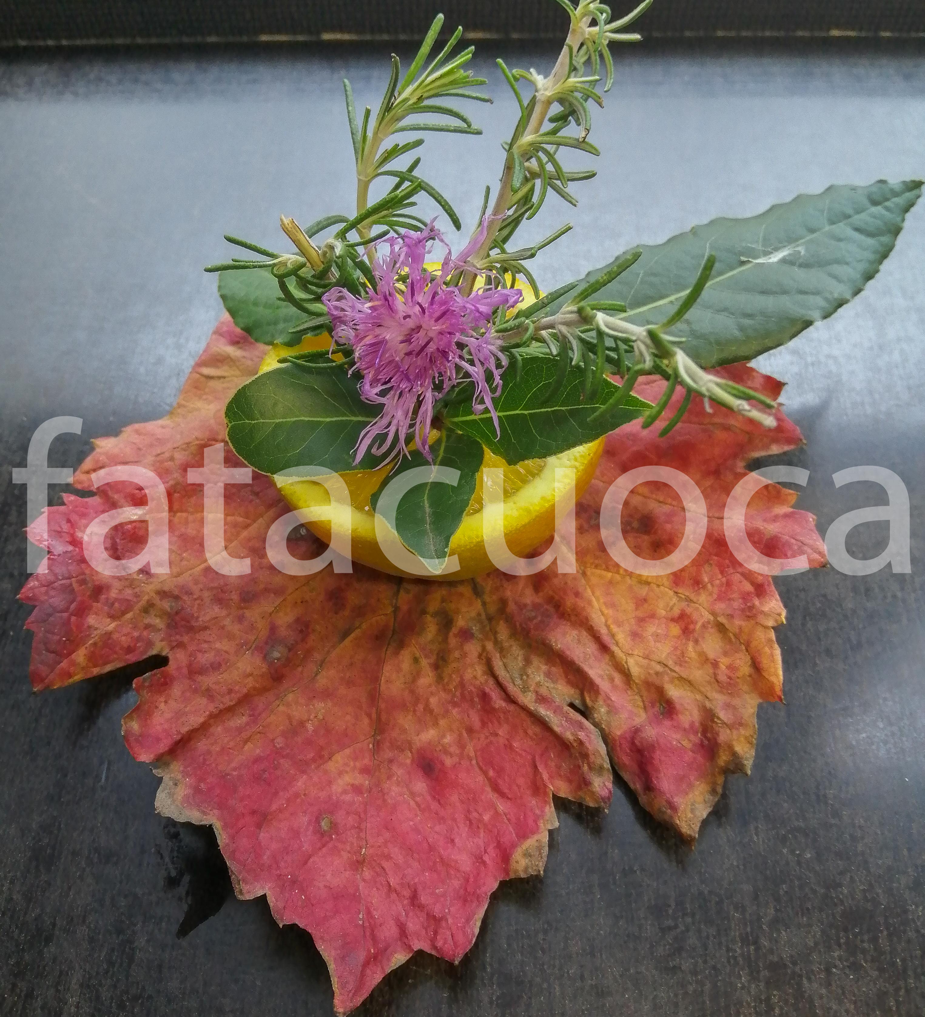 Li ho preparati anche i più piccini della sezione Lattanti utilizzando : foglie di vite, mandarini, limoni, rosmarino, alloro e origano completando con fiori di ciclamino del nostro giardino.