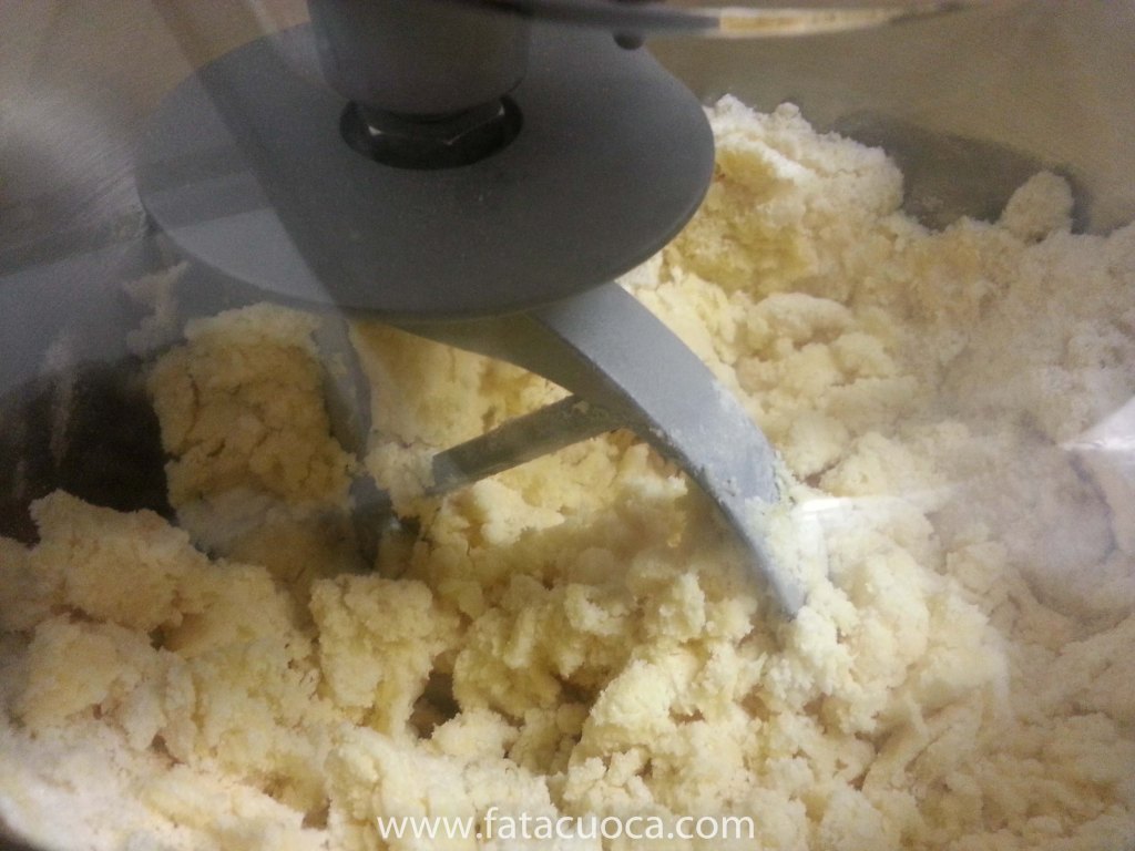 Procedimento: mescolare la parte secca (farina, zucchero, scorza di limone e vaniglia) aggiungere il burro e sabbiare poi aggiungere le uova e mescolare velocemente per non scaldare troppo l’impasto.