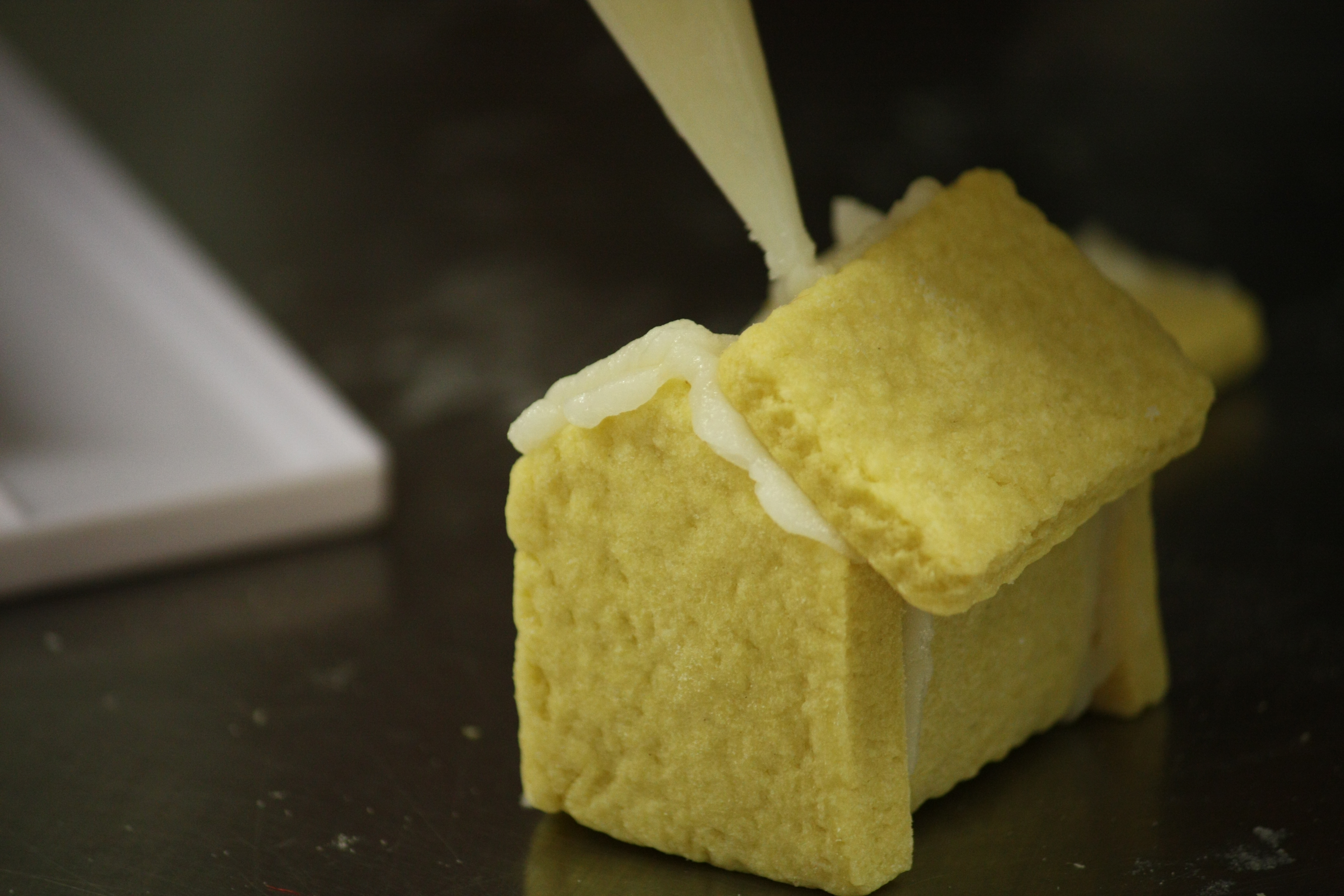 Purtroppo non ho fotografato la cottura ma per capire meglio la costruzione della casetta ho trovato foto di un corso fatto qualche anno fa, per costruirla avevo usato la ghiaccia ma si possono usare anche cioccolato bianco e fonfente.