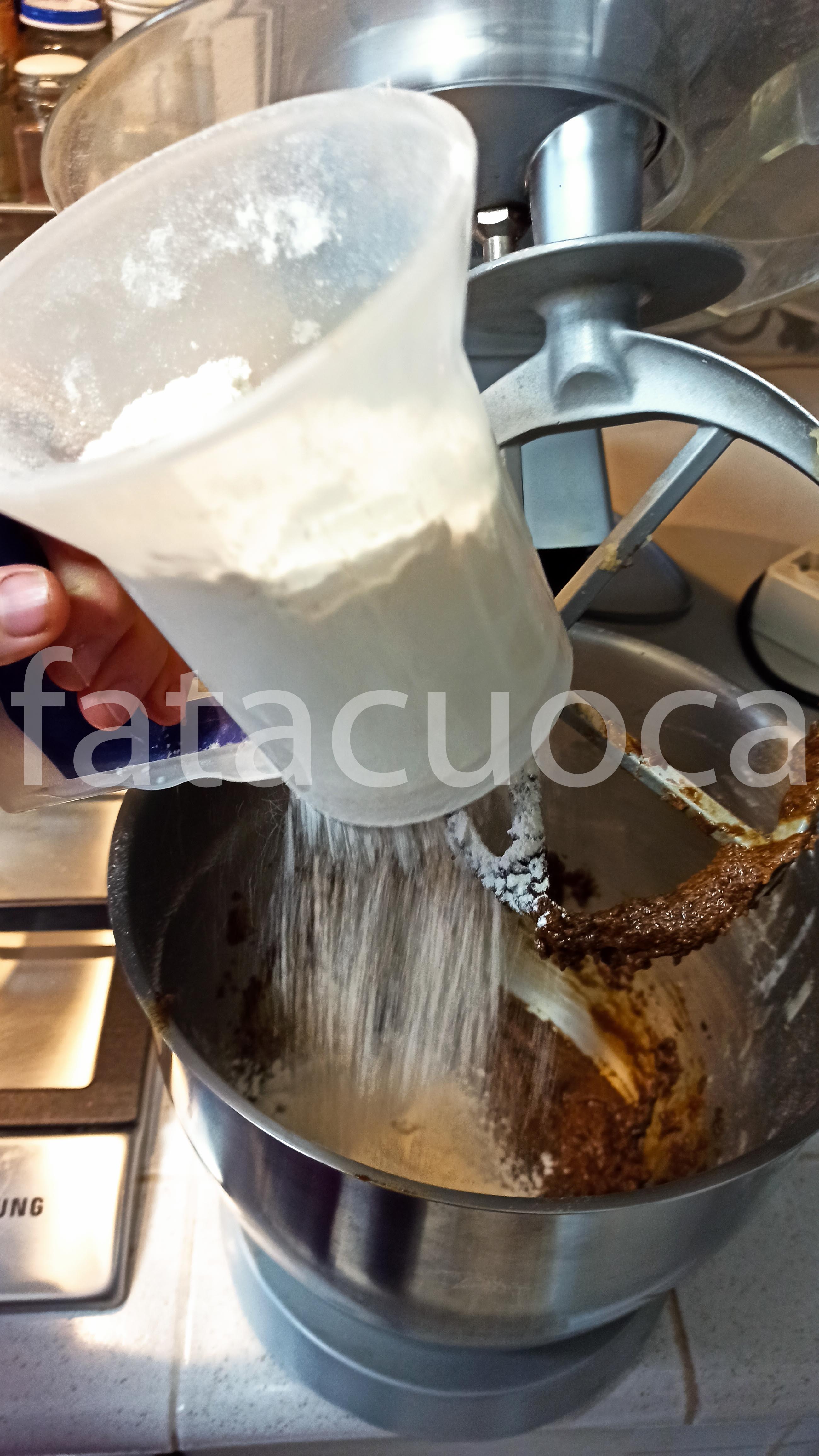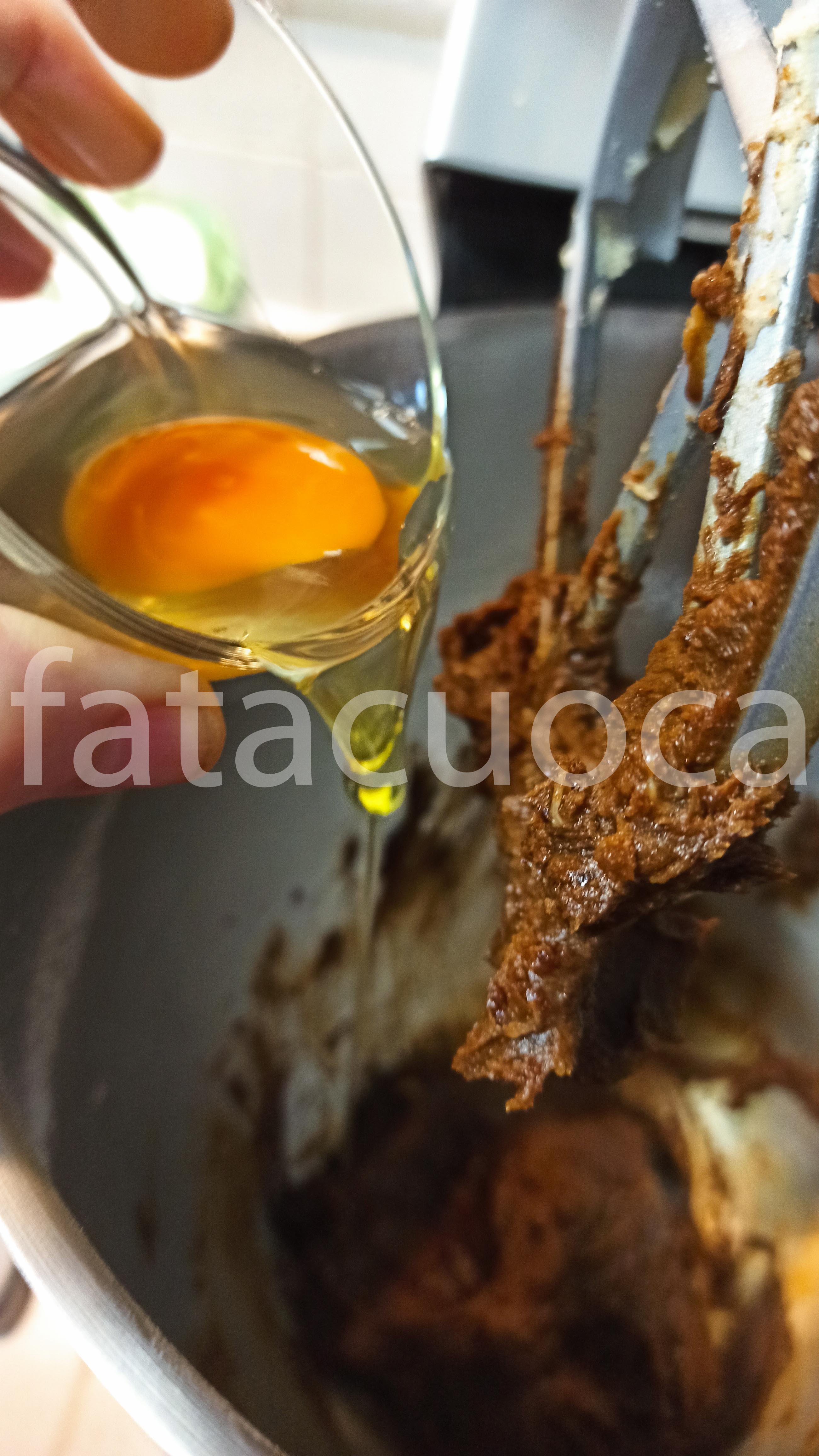 versare nella planetaria in ordine la melassa con il burro e lo zucchero di canna quando sono ben amalgamati unire l’uovo, le spezie, il sale e la noce moscata ed infine la farina