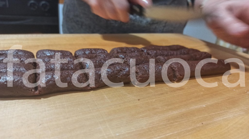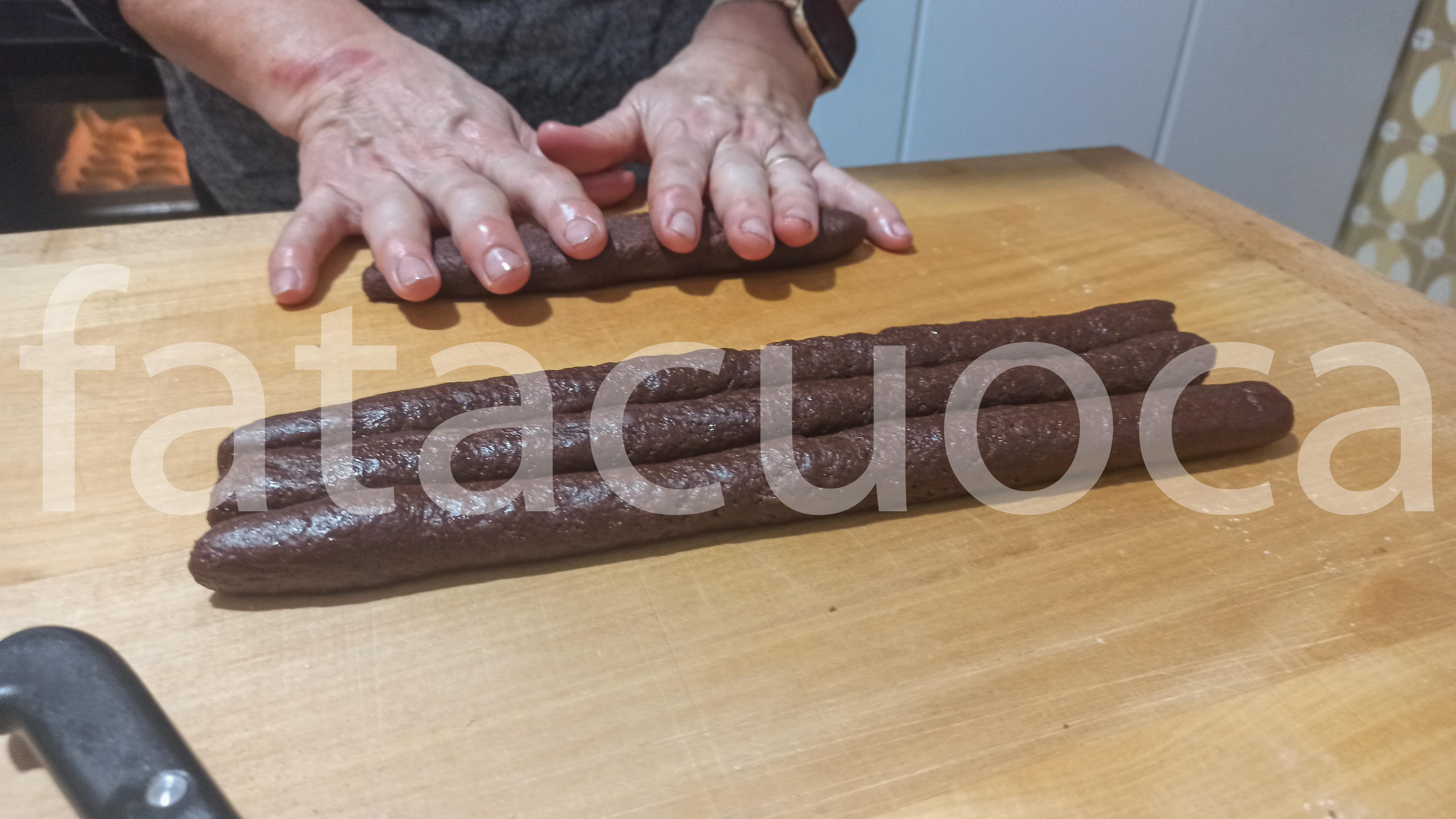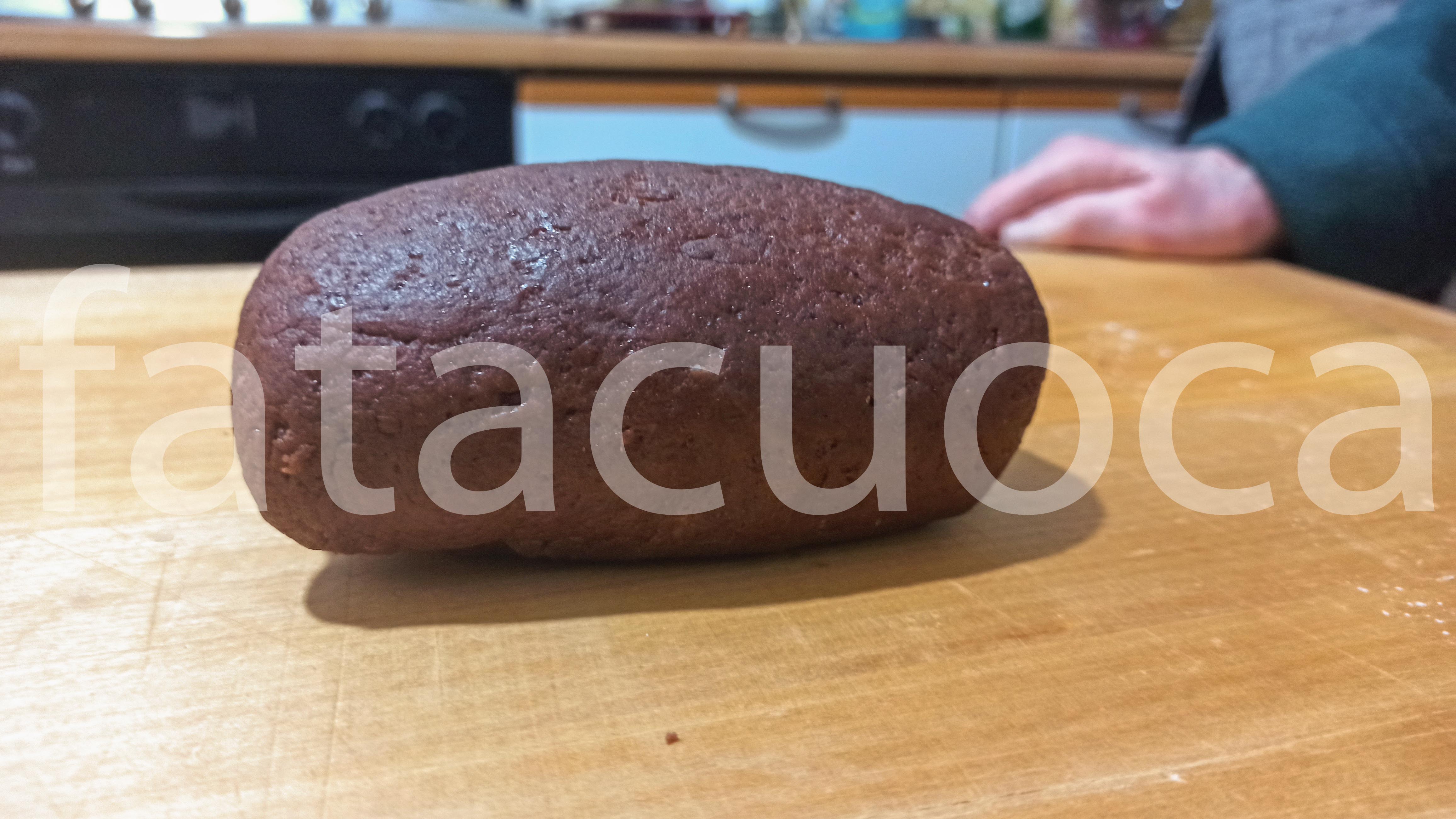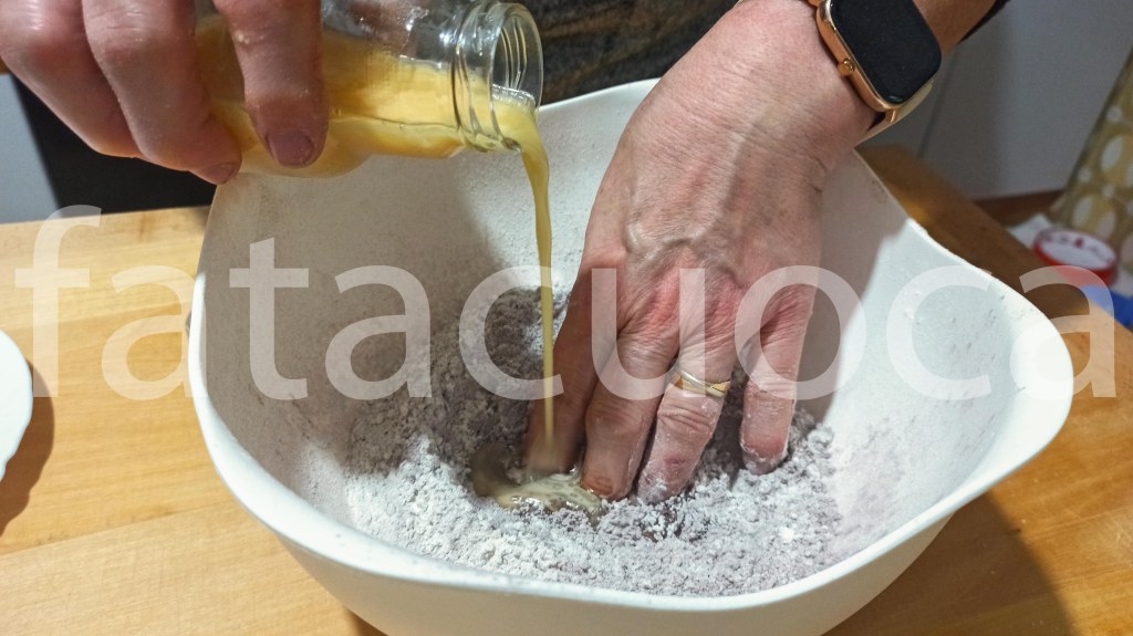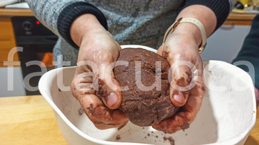 in una ciotola mettere farina, cacao e zucchero poi aggiungere l’uovo battuto il latte e l’olio mescolare bene poi finire di impastare su un tagliere