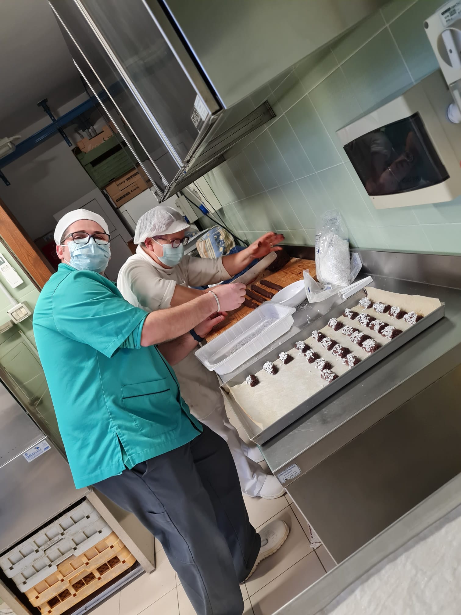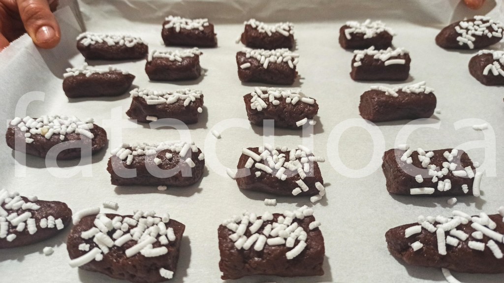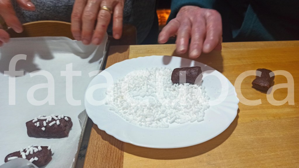dividere il composto in 2 parti e da ogni parte formare 4 filoncini. Dividerli in 6 parti poi passarli nello zucchero in granella