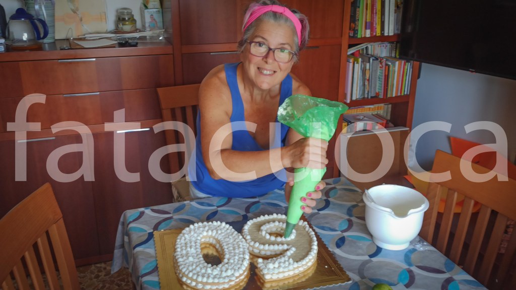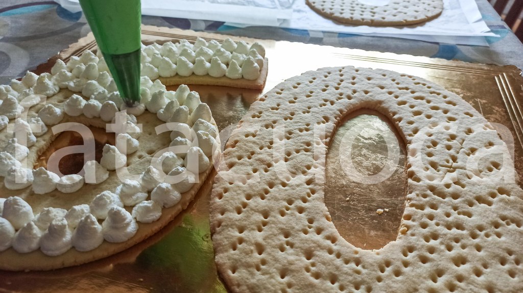 Mettere la crema in una sacca a poche con bocchetta 10 mm liscia e e formate dei ciuffetti su tutta la superficie dei numeri. Posizionate quindi i numeri di frolla corrispondenti sopra i ciuffi di crema e fare un secondo strato di crema, fino a ricoprire tutta la superficie.
