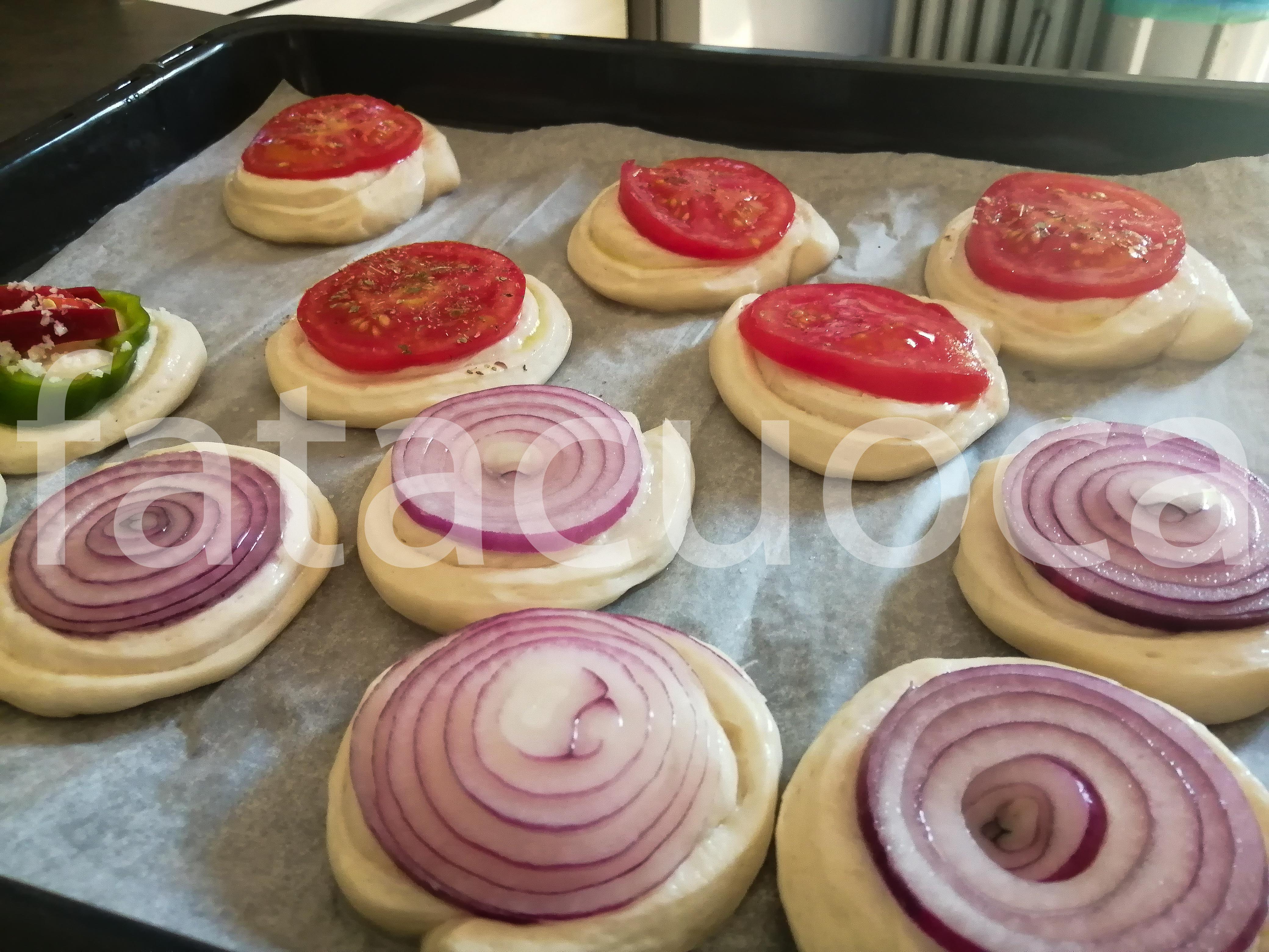 mettere sopra alle girelle la verdura tagliata a misura e condita con olio e sale, a piacere anche origano e timo.