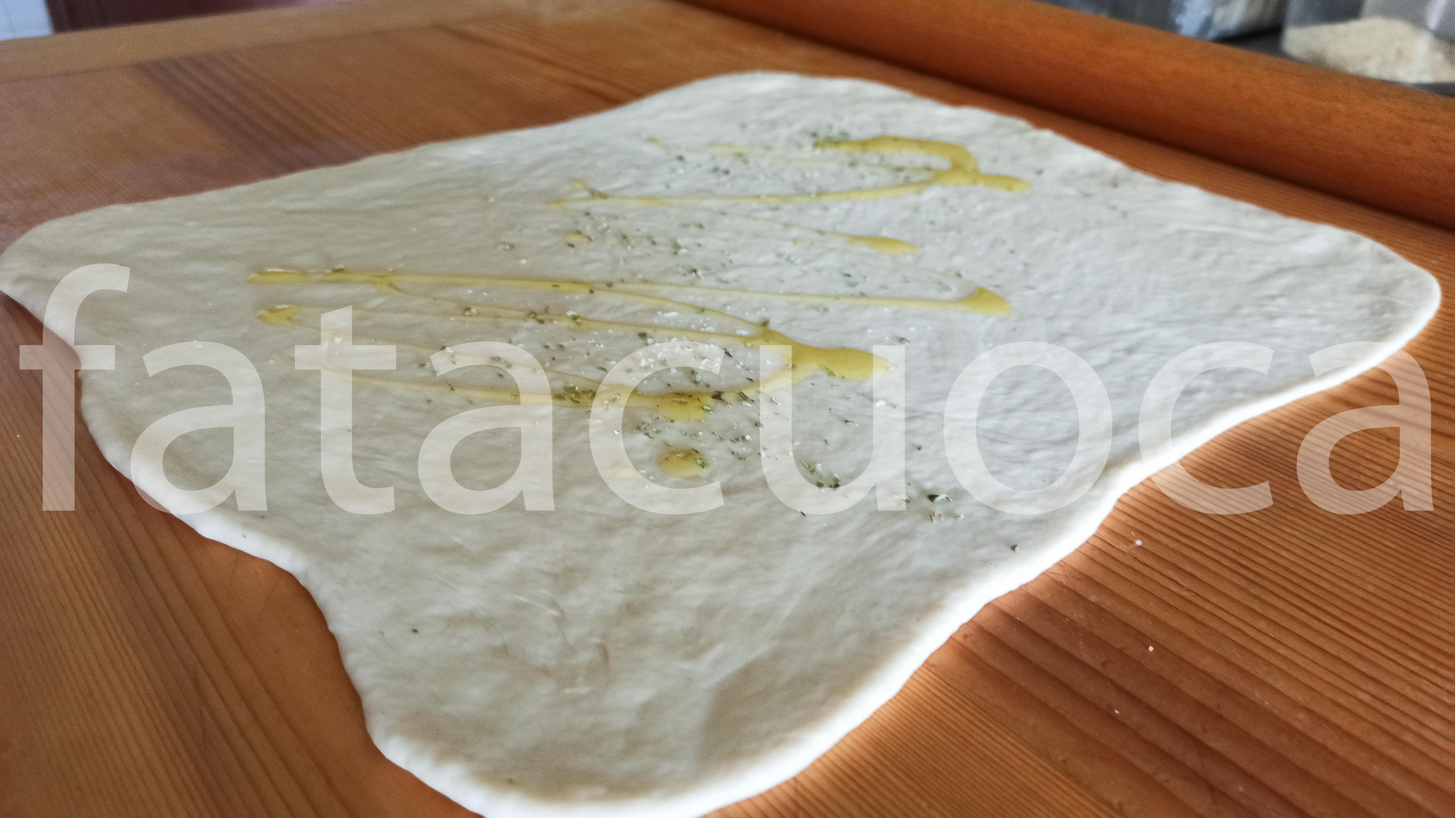 sciogliere il lievito in circa 50 ml di acqua, in una ciotola mettere farina e zucchero e incominciare ad aggiungere il lievito sciolto e l’acqua. Quando l’impasto è ben legato aggiungere l’olio e in fine il sale.