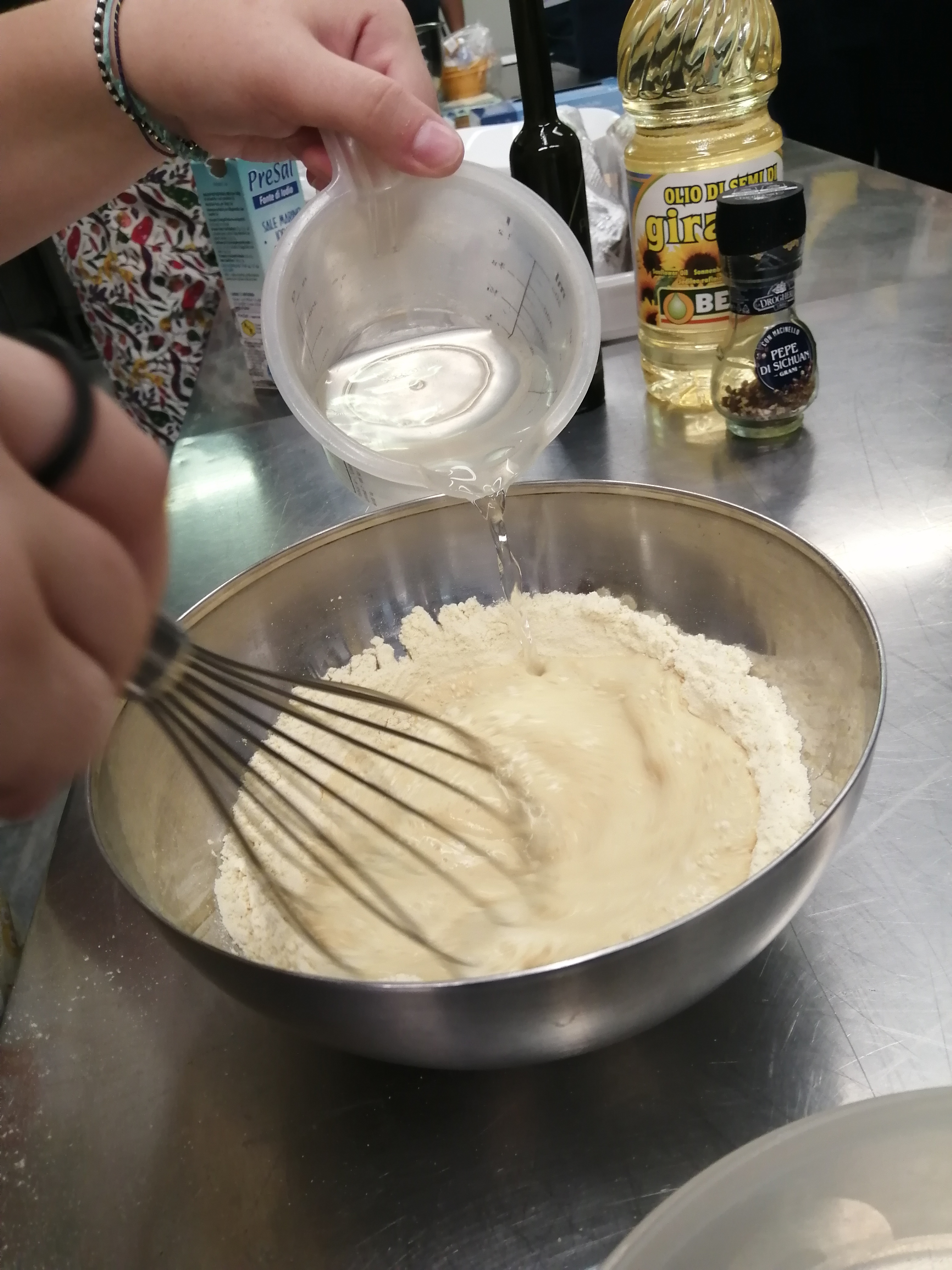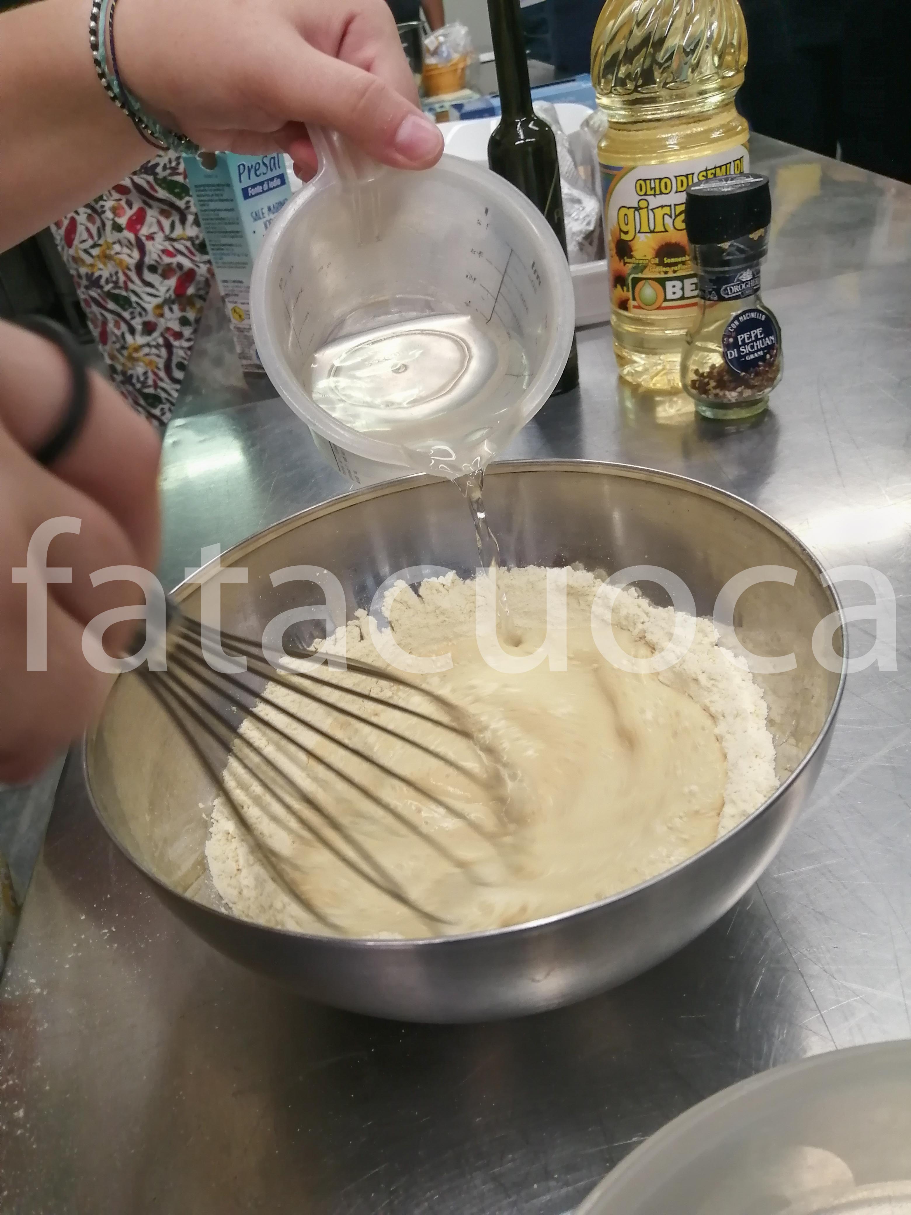 in una ciotola mescolare con una frusta farina di ceci, l’acqua aggiungendola poco alla volta per non fare i grumi e il sale; coprire con pellicola e lasciare riposare 2 ore.