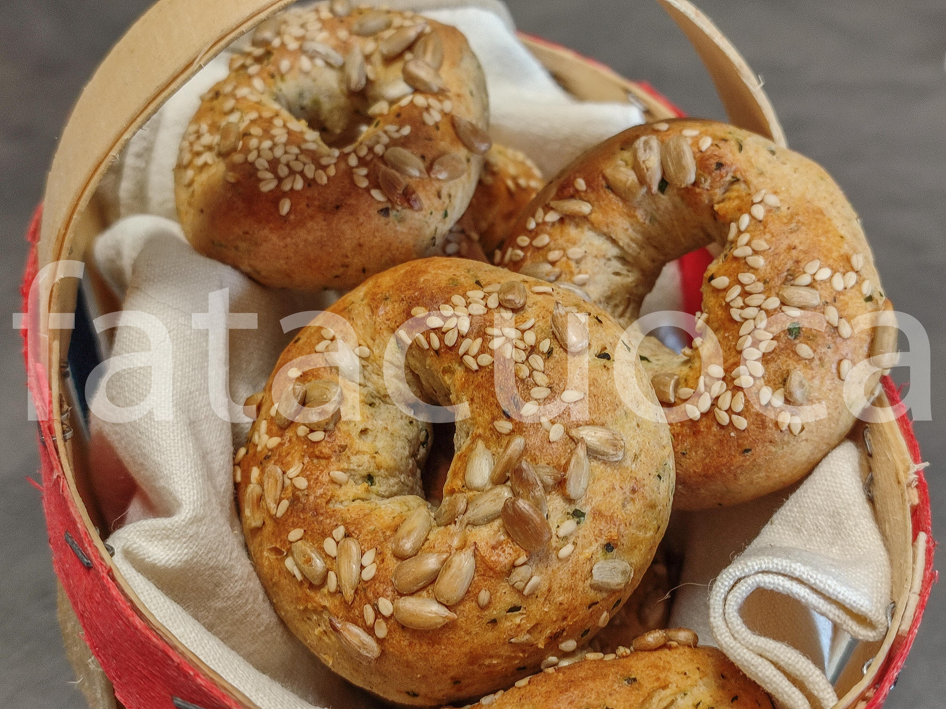 Procedimento: amalgamare la farina con il burro, il lievito, le erbe aromatiche, aggiungere i fiocchi di patate e lavorare l’impasto fino a e renderlo liscio ed omogeneo, ricavare 4 palline con un dito bucare il centro dando la forma di ciambella. Spennellarle con latte e cospargere di semini.