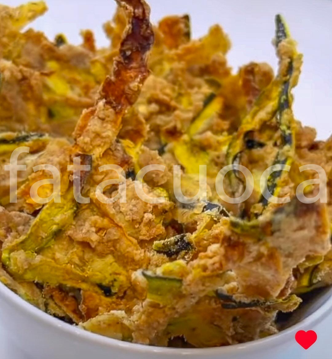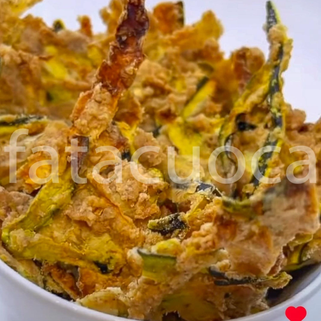 Procedimento: tagliare con il pelapatate a listarelle le zucchine, condirle con olio e sale; aggiungere la farina, stendere il composto su una teglia coperta di cartaforno unta e infornare a 180°C per 20- 25 minuti, a metà cottura io li ho girati. Spezzettare il composto croccante e servire. E’ piaciuto tantissimo!!!