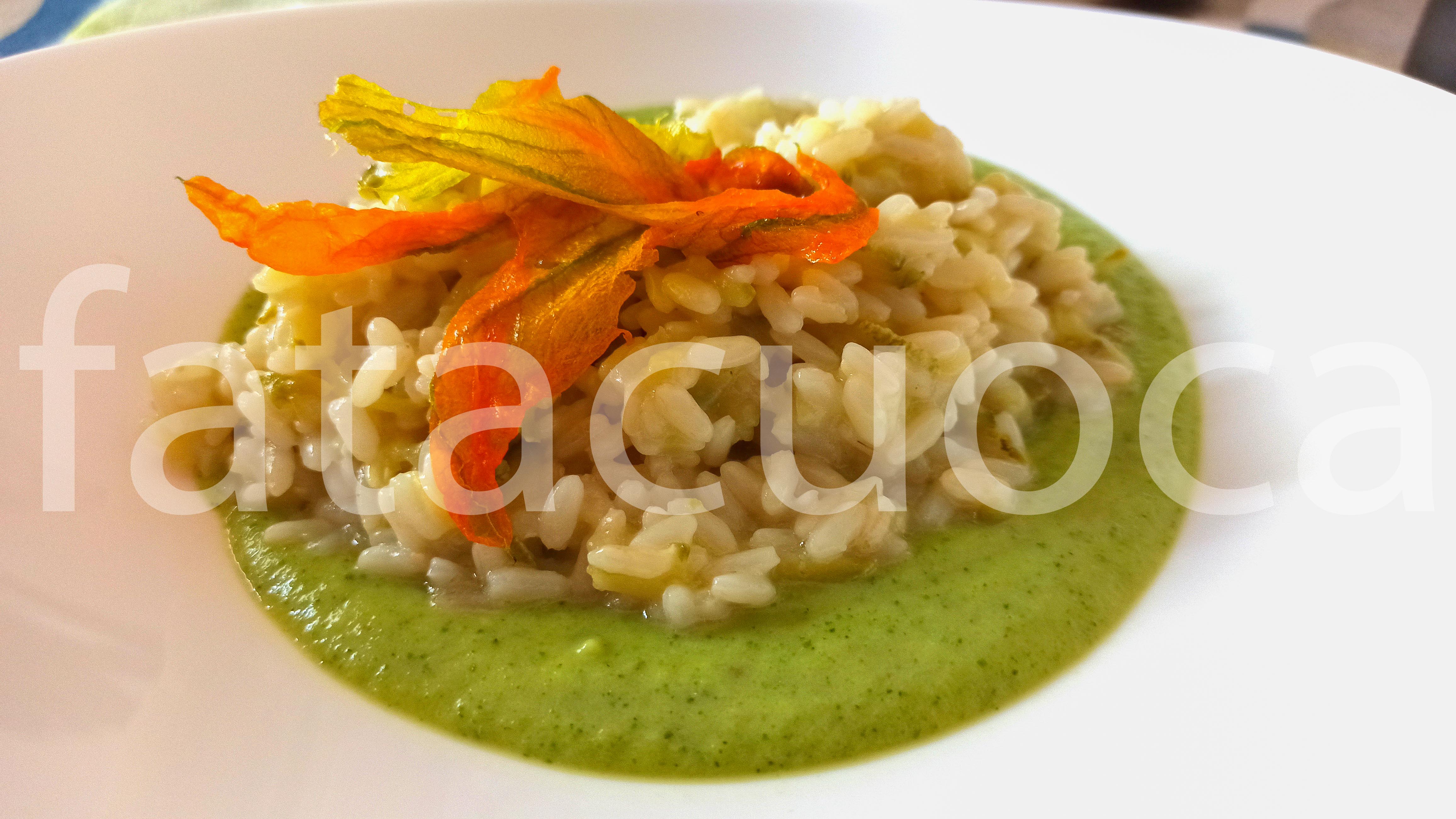 Risotto per 2 persone: olio 20 g, cipolla 20g riso 160g , vino bianco1/2 bicchiere, zucchina grattugiata 150g, burro 30g parmigiano 20g brodo vegetale mezzo litro circa. Procedimento: tritare la cipolla e rosolarla in una casseruola a fuoco basso, aggiungere il riso e quando si è sigillato aggiungere il vino bianco. Quando è evaporato aggiungere la zucchina tritata e il brodo vegetale io mi regolo 2 mestoli grandi per 80 g di riso. cuocere il riso in base al suo tempo di cottura e mantecarlo con il burro e il parmigiano.