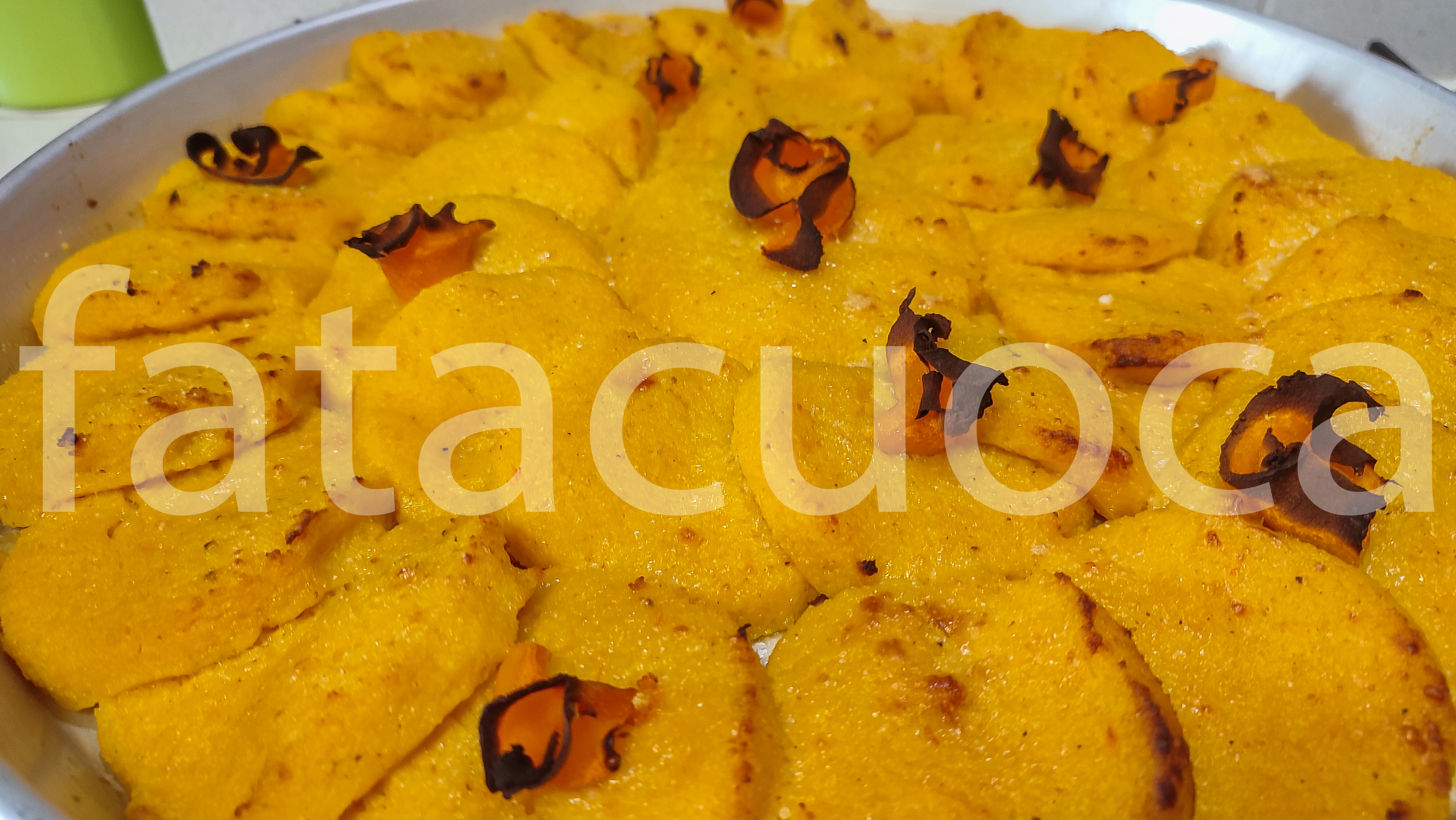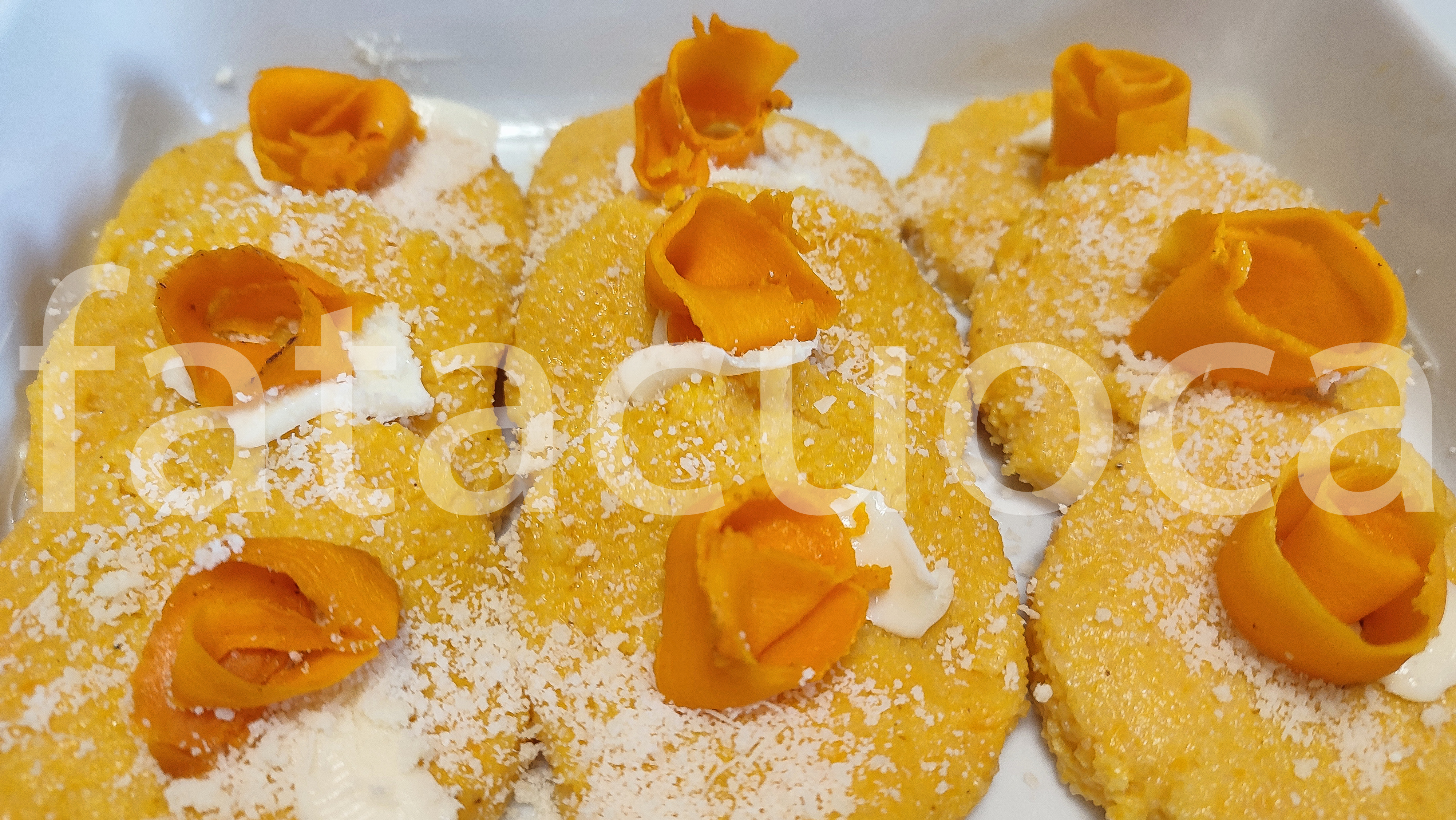 6. ricavare dei dischi e metterli in una pirofila imburrata. Distribuirci sopra dei fiocchetti di burro, nastri di zucca e parmigiano