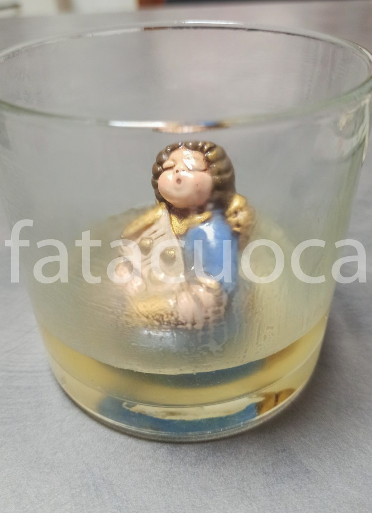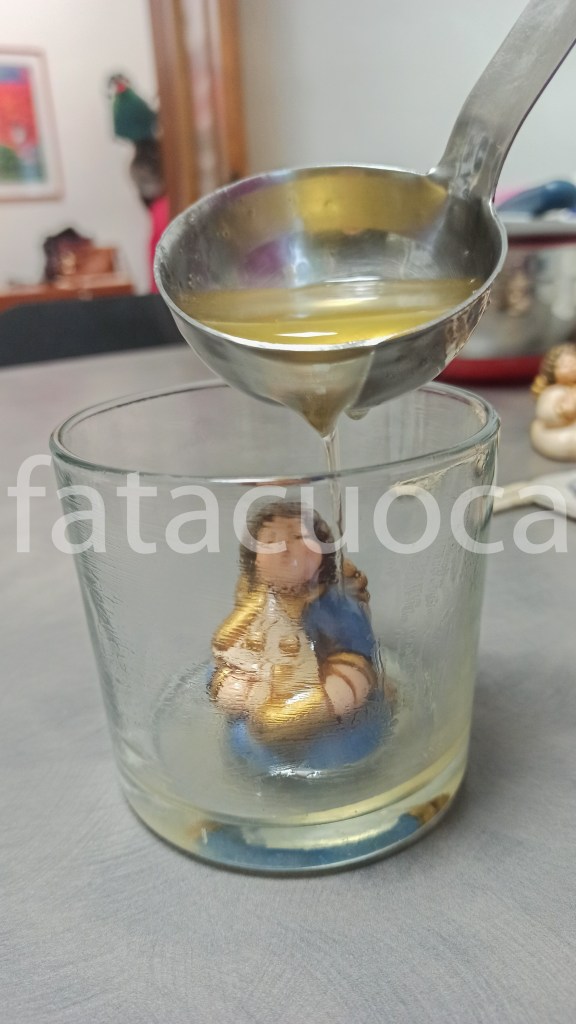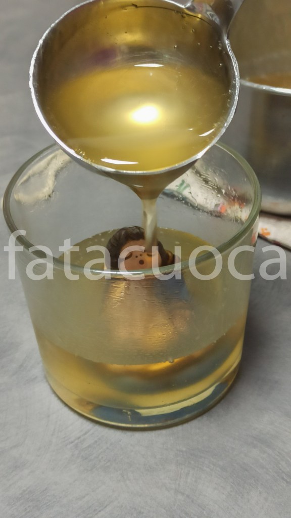 Una volta pronta la gelatina versarne un po’ nel contenitore in modo da fissare la statuina che si è decisa di usare ( altrimenti quest’ultimo galleggia) .