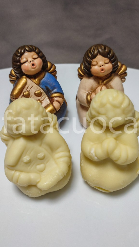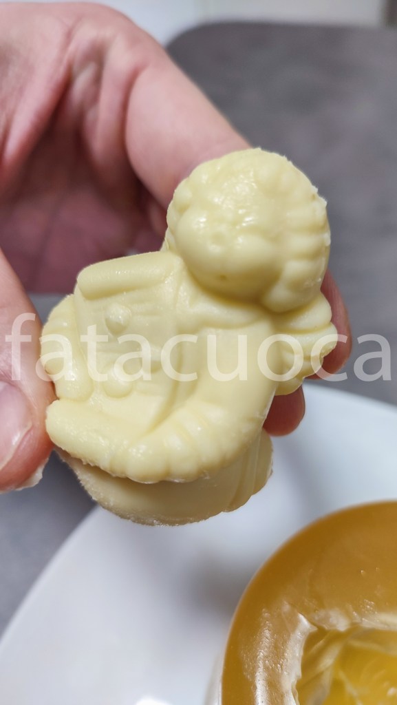 Ora versare il cioccolato bianco nella cavità formata dalla statuina e lasciarla solidificare estrarre delicatamente e lasciarla asciugare a temperatura ambiante
