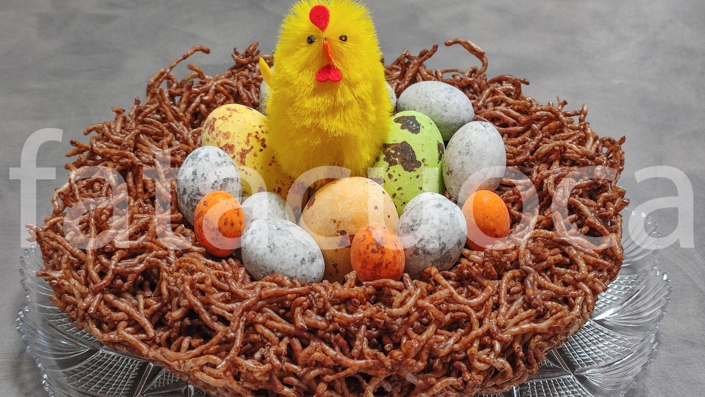 Procedimento: tuffare poco per volta gli spaghetti di riso nell’olio caldo per 3 secondi. Sgocciolarli sulla carta assorbente. Sciogliere il cioccolato e glassare gli spaghetti. Rivestire una terrina con pellicola e formare il nido. Quando si è raffreddato è pronto per essere decorato; io ho usato le uova confettate e