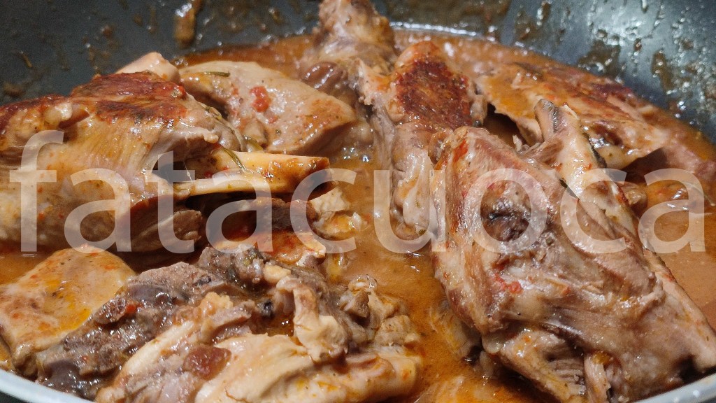 Preparazione: rosolare a fuoco vivo l’agnello in una casseruola con un po’ d’olio. Salare, aggiungere le erbe aromatiche tritate sfumare con vino e aceto insieme, lasciare evaporare e aggiungere ½ bicchiere di acqua in cui si deve sciogliere la farina e la passata di pomodoro.