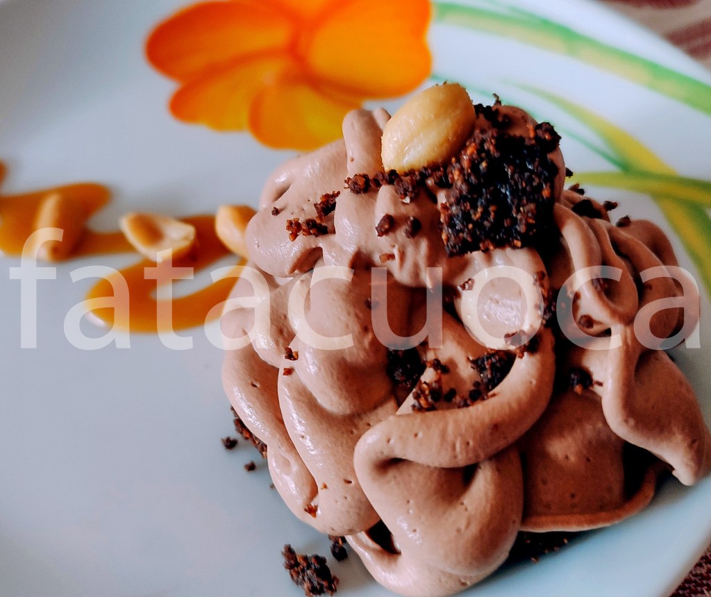 Procedimento: tritare finemente il cioccolato e metterlo in un contenitore stretto e alto. Far bollire la prima dose di panna e metterci la gelatina precedentemente ammollata in acqua fredda. Metterla nel contenitore con il cioccolato ed emulsionare con il minipimer, aggiungere anche la seconda parte di panna fredda ed emulsionare ancora qualche secondo. Coprire con pellicola a contatto e lasciare in frigorifero almeno una notte. Quando è ben fredda montarla con la frusta e metterla in una sacca a poche.