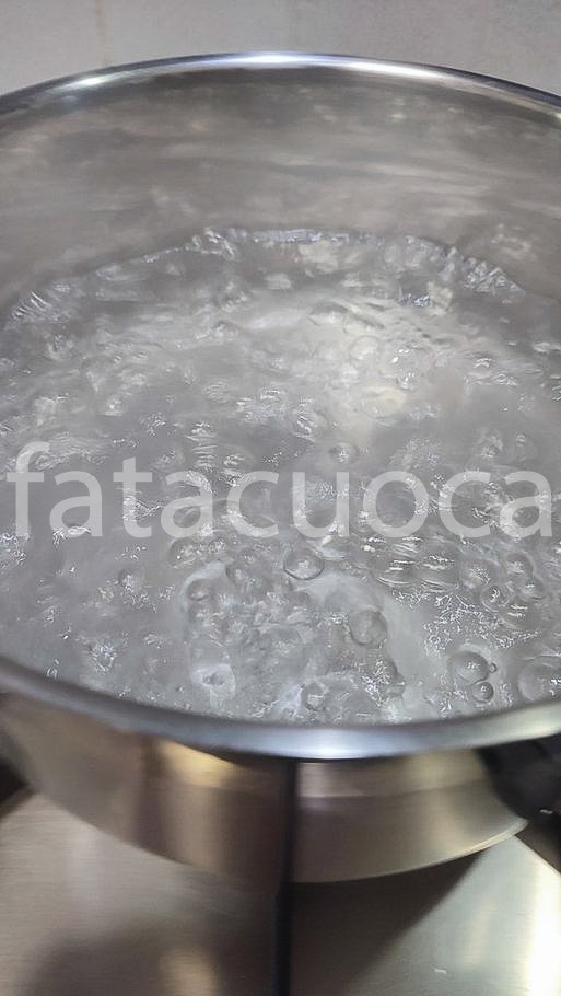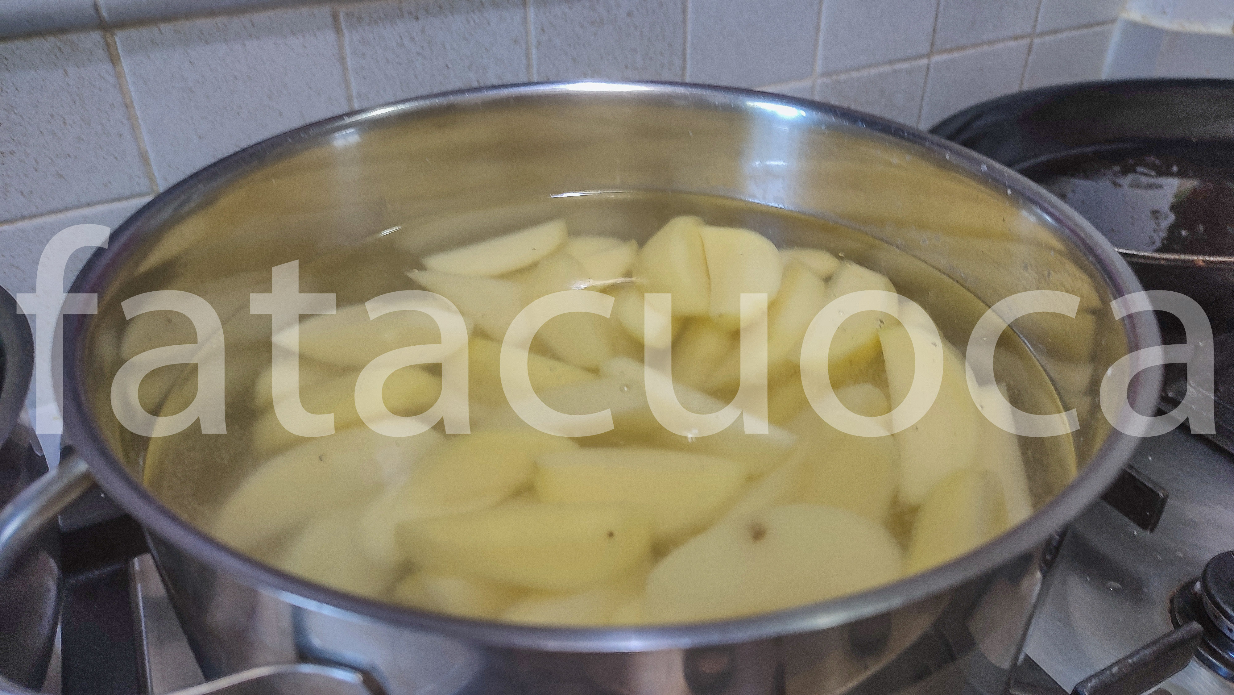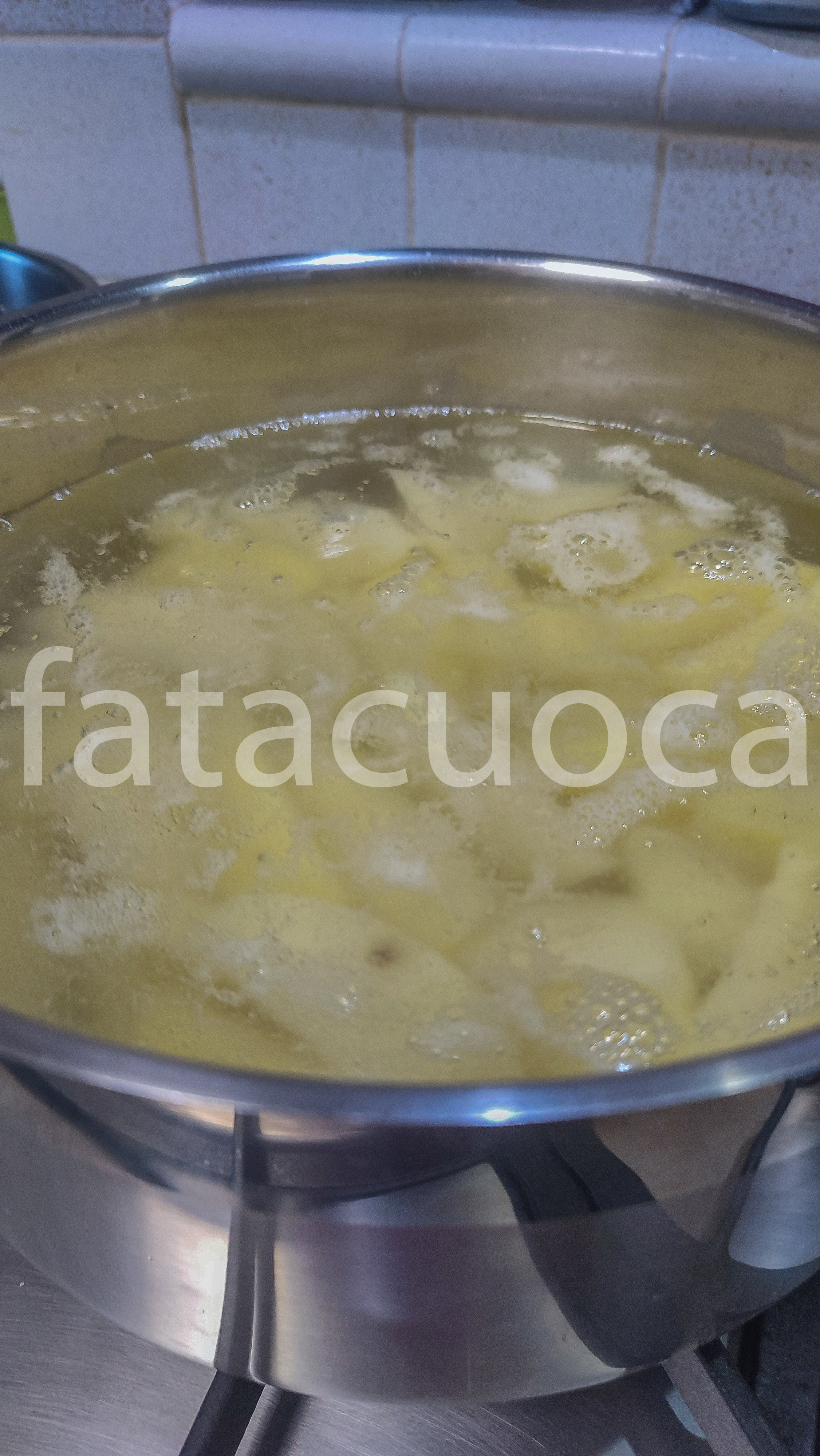 In un tegame capiente portare ad ebollizione l’acqua, quando bolle aggiungere sale grosso e mettere le patate scolate