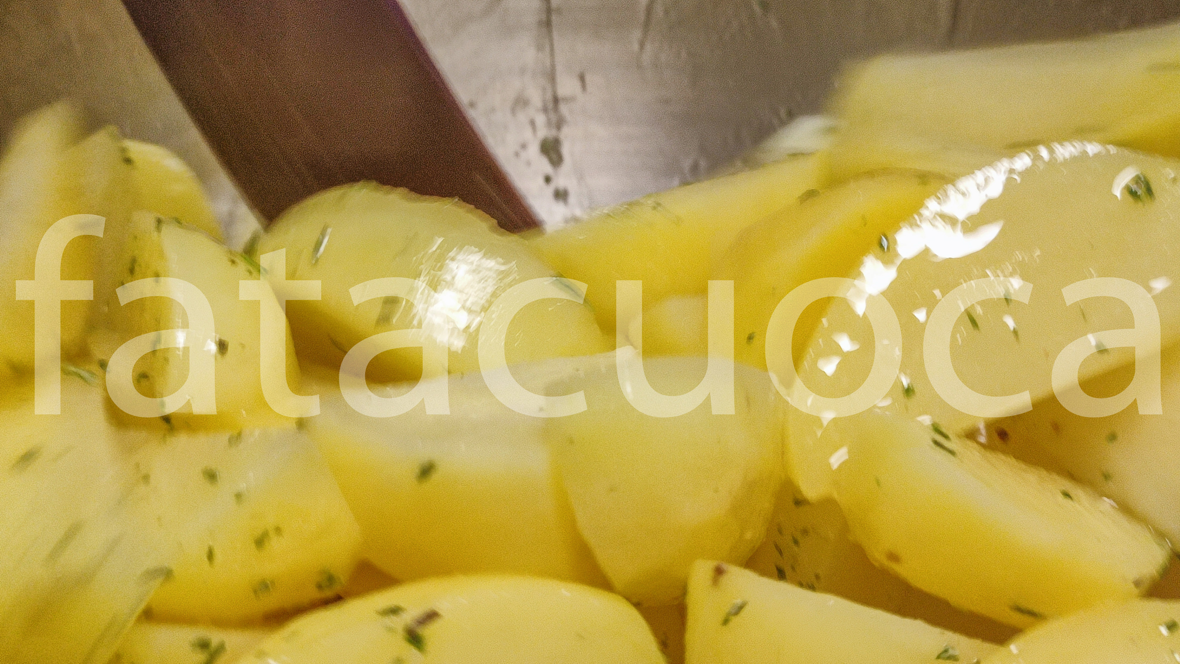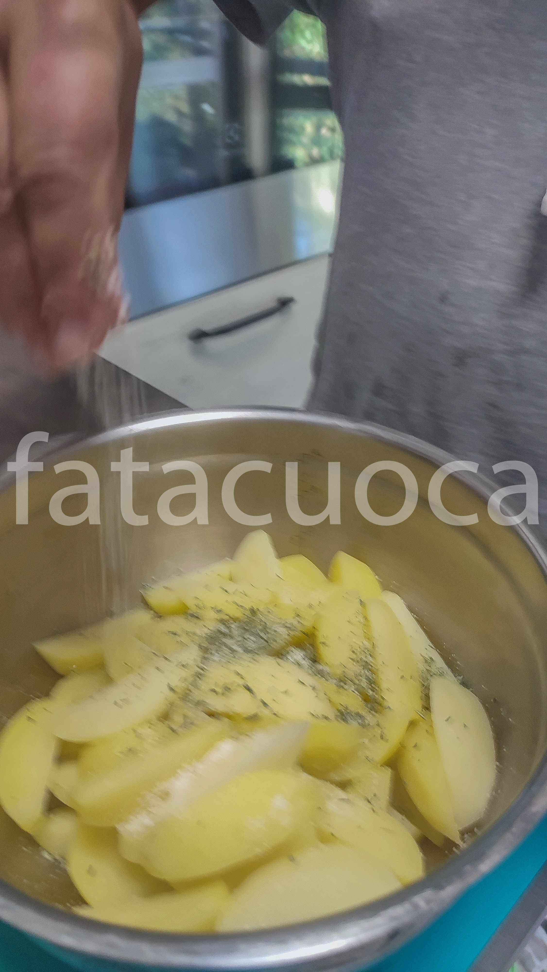 .Appena ricomincia a bollire scolare le patate in una ciotola, salare, mettere un po’ di sale aromatizzato e olio.