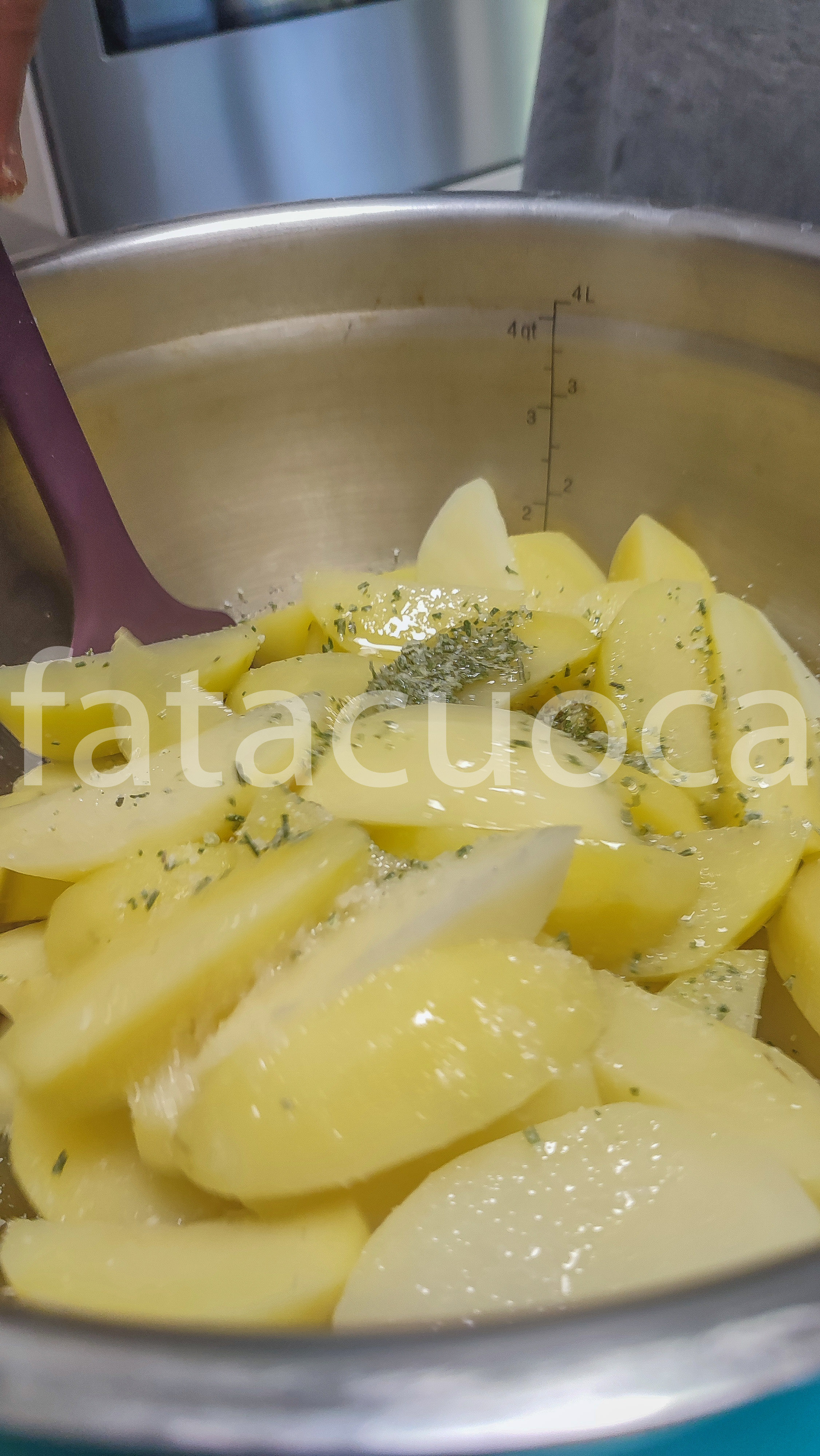 Mescolarle bene e distribuire le patate su una placca coperta con carta forno.