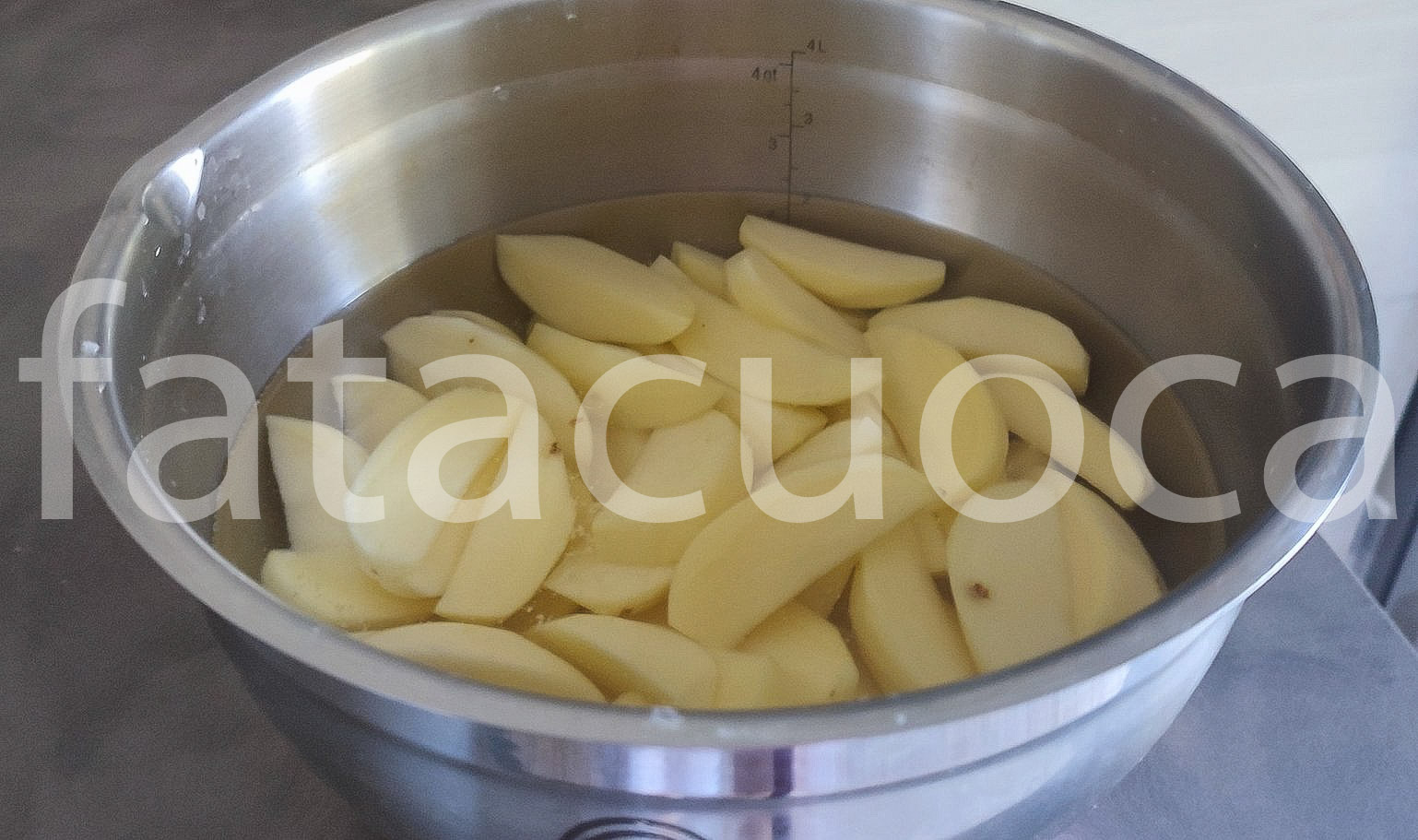 In un tegame capiente portare ad ebollizione l’acqua, quando bolle aggiungere sale grosso e mettere le patate scolate
