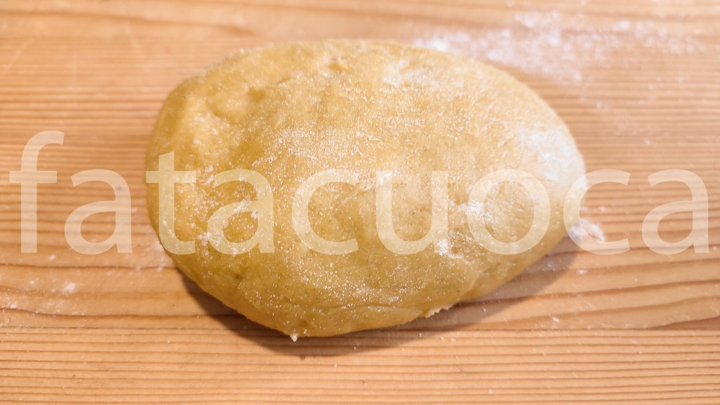 Preparare la pasta unendo le farine alle uova e i tuorli, impastare bene fino a che risulta liscia. Coprire con pellicola e lasciarla riposare in frigorifero un ora.