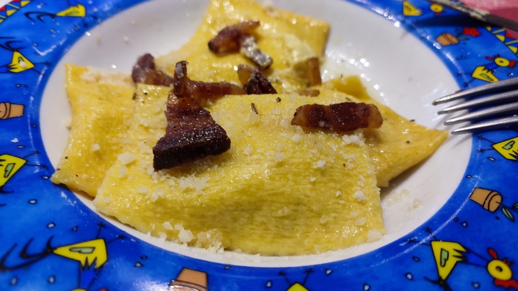 Ho mangiato questa prelibatezza a Roma, a casa della mia cara amica Serenella. Ci hanno voluto stupire con i loro cavalli di battaglia così Mauro ha preparato i cappellacci alla carbonara e Serenella il pollo con i peperoni e ci sono riusciti tutto BUONISSIMO.