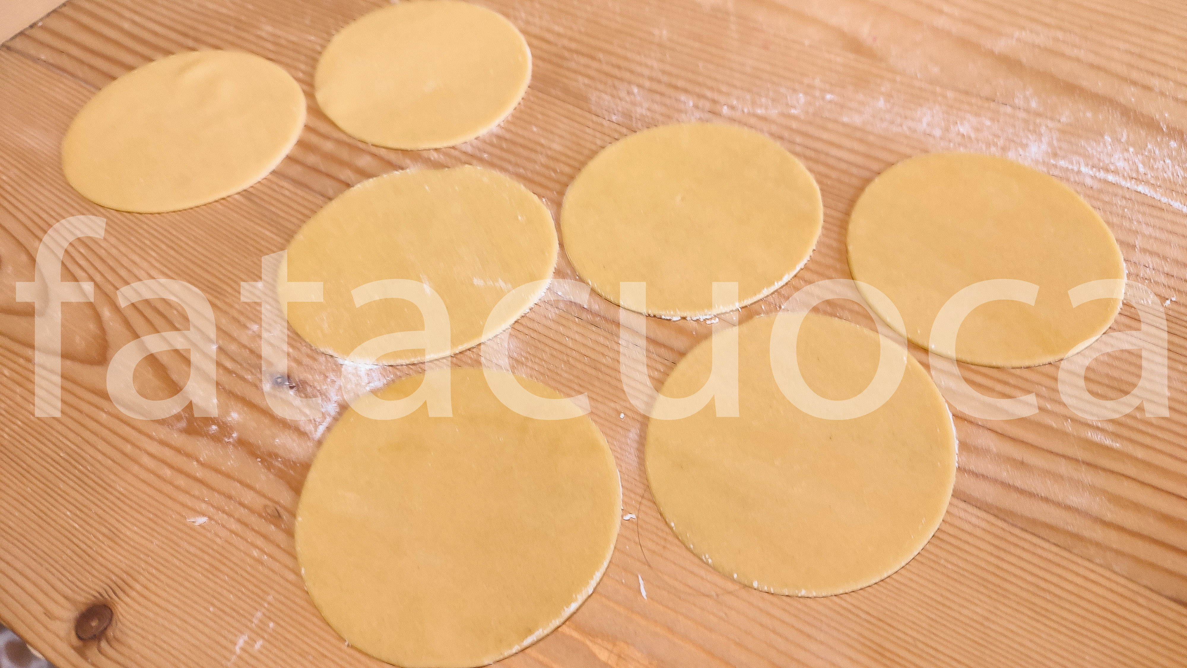 Tirare la pasta sottile, tagliarla con un coppa pasta tondo diametro 8 ( volendo anche più grande)