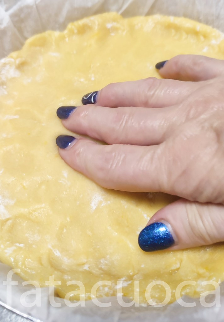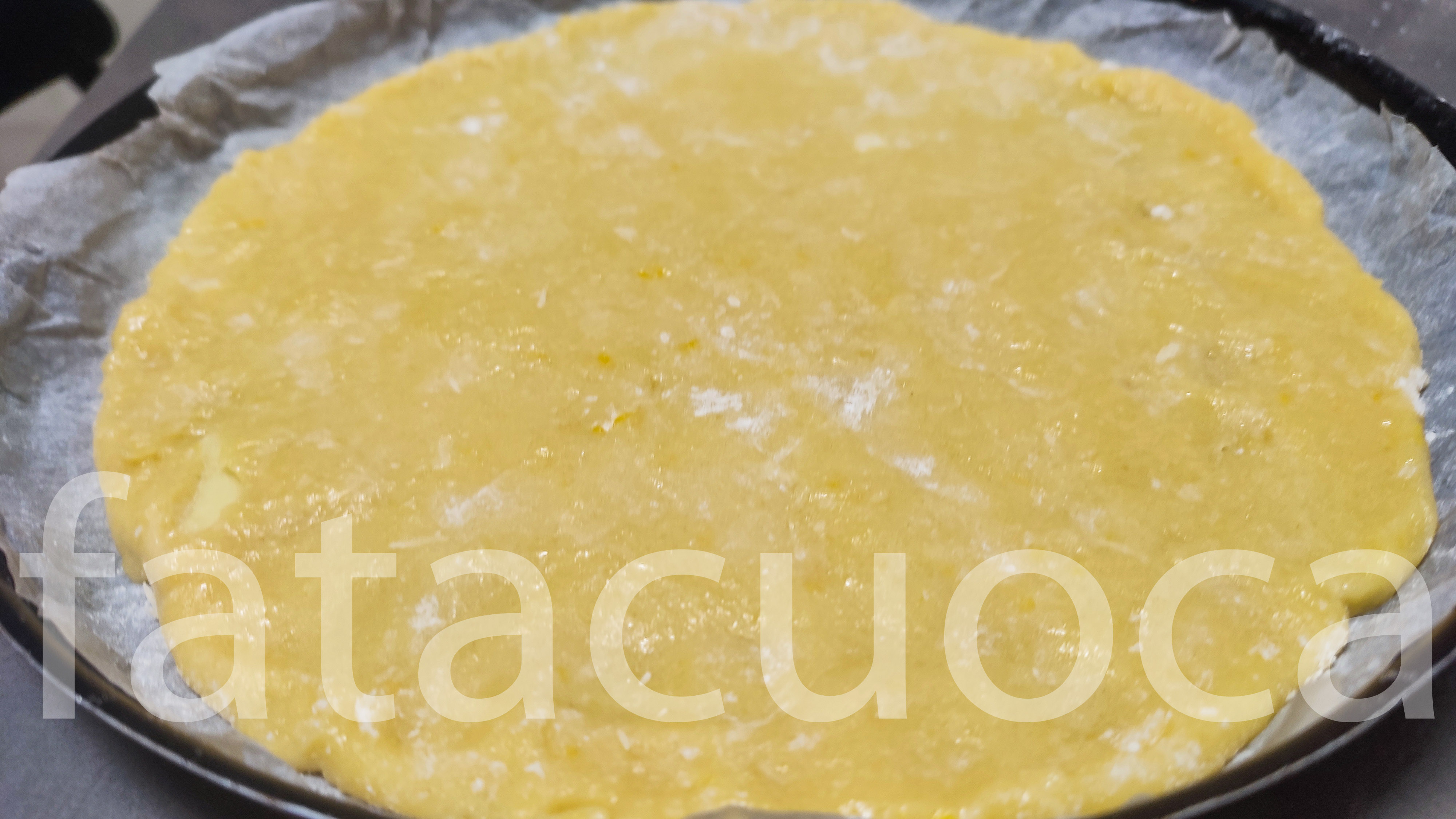 mettere sul fondo di una teglia un foglio di carta da forno , appiattite l’impasto con le mani leggermente unte o infarinate.