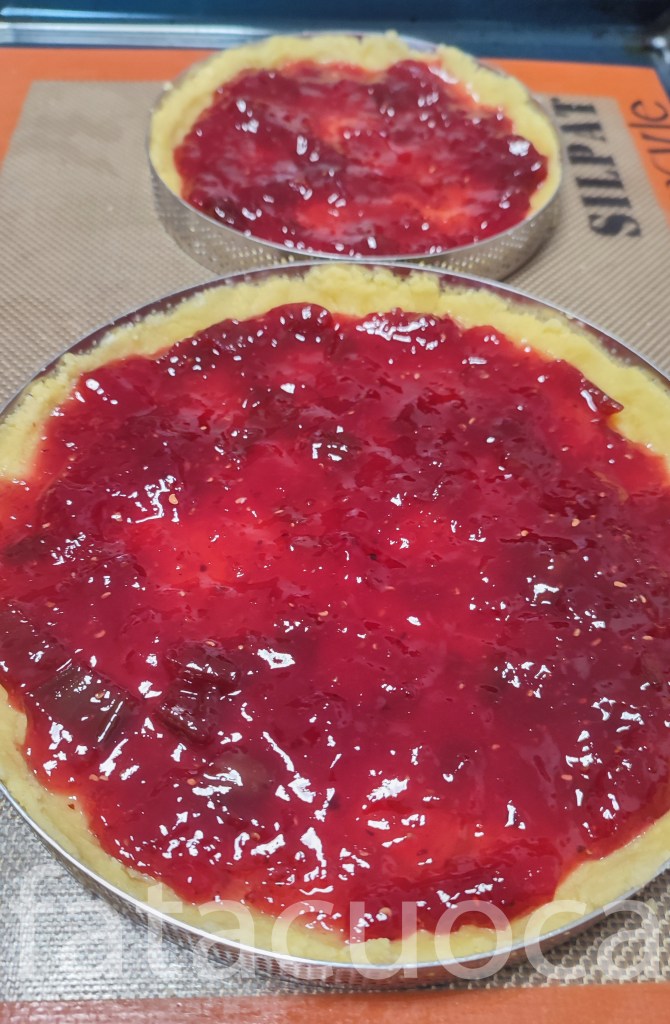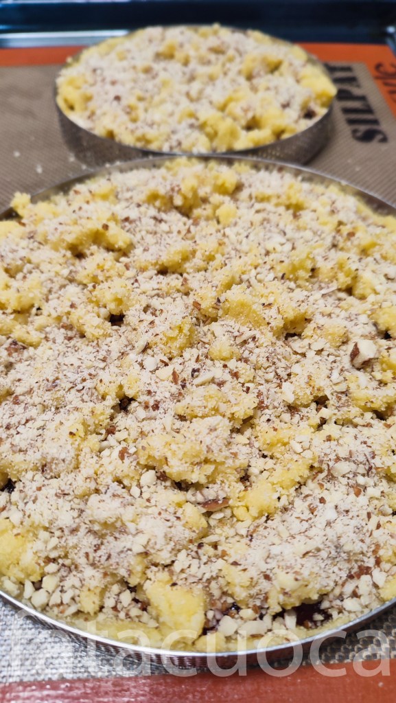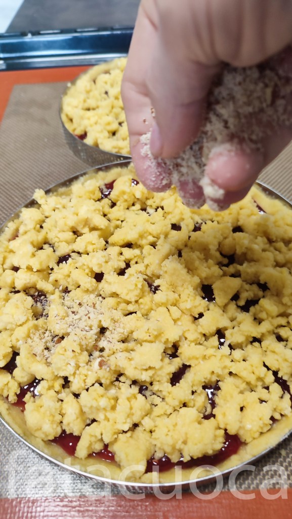 spendere metà dell’impasto nella teglia e schiacciare con le mani poi distribuire la marmellata. Coprire con la rimanente metà di impasto e distribuire le mandorle sopra. Io ne ho fatte due una diametro 20 e una 15 cm
